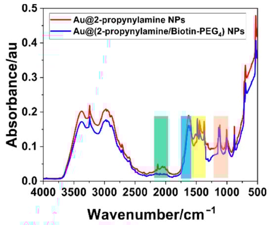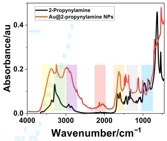 The FTIR-ATR spectra of neat 2-propynylamine (black) and Au@2-propynylamine NPs (red) are shown in Figure 6. The assignments of the observed bands that originate from both 2-propynylamine and Au@2-propynylamine NPs are presented in Table 1. 2-propynylamine bands are assigned based on the literature [50], and nanoparticle bands are assigned based on analogy.