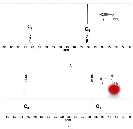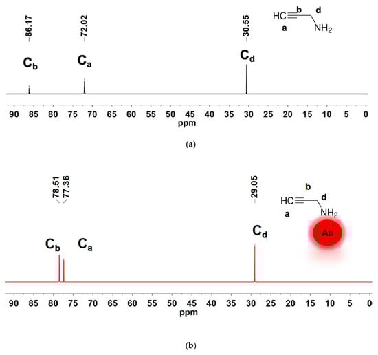 13C NMR spectra for: (a) 2-propynylamine in DMSO-d6 and (b) freshly synthesized Au@2-propynylamine NPs in water (shown in red).