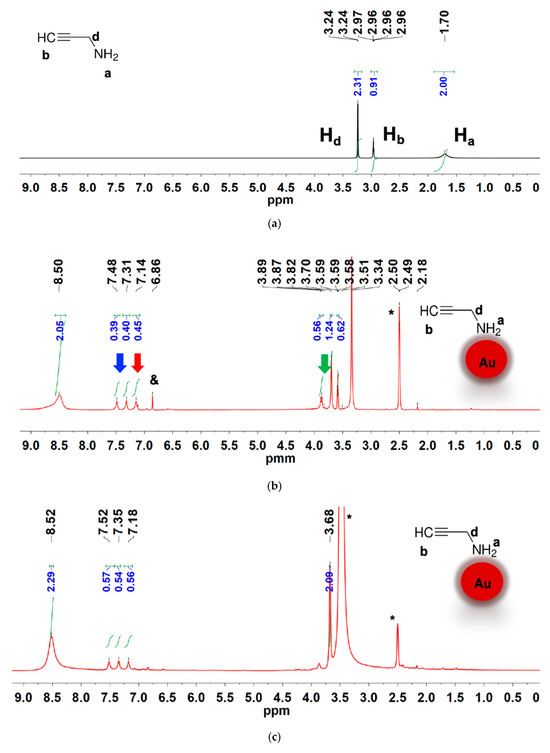1H NMR spectra in DMSO-d6 for: (a) 2-propynylamine, (b) freshly synthesized Au@2-propynylamine NPs, and (c) Au@2-propynylamine NPs after six months. The amine proton shifts from 1.70 ppm in the free ligand to 8.50 ppm (blue arrow) upon coordination to AuNPs. Additional signals at 7.48–6.86 ppm (red arrows) indicate minor species, while peaks near 3.89 ppm (green arrow) suggest side products. Asterisks (*) denote residual DMSO-d6, and ampersands (&) mark impurities.