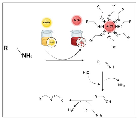 Schematic illustration of proposed mechanism for oxidation of primary amines by gold: formation of imines, AuNPs, and ammonium ions.