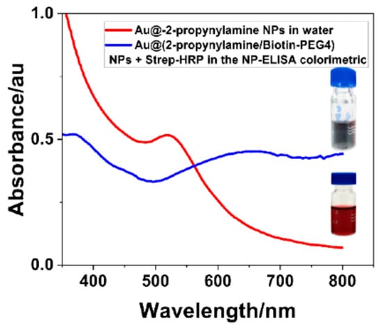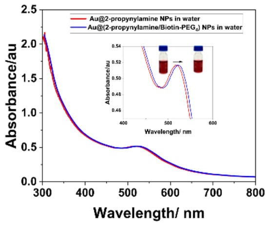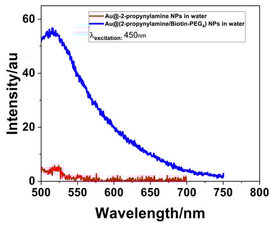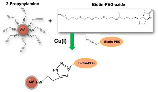 To demonstrate the chemical accessibility and reactivity of the terminal alkyne groups on Au@2-propynylamine nanoparticles, Cu(I)-catalyzed azide–alkyne cycloaddition (CuAAC) was performed using Biotin-PEG4-azide as a prototypical ligand [26,27]. In this approach, the biotin moiety serves as a high-affinity biomolecular recognition element, while the PEG4 spacer and terminal azide enable efficient, site-specific covalent attachment of the Biotin-PEG4 ligand to the nanoparticle surface through triazole formation [28,29]. This strategy ensures that the resulting gold nanoparticles are functionalized with biotin groups, making them suitable for further bioconjugation and recognition-based applications.
