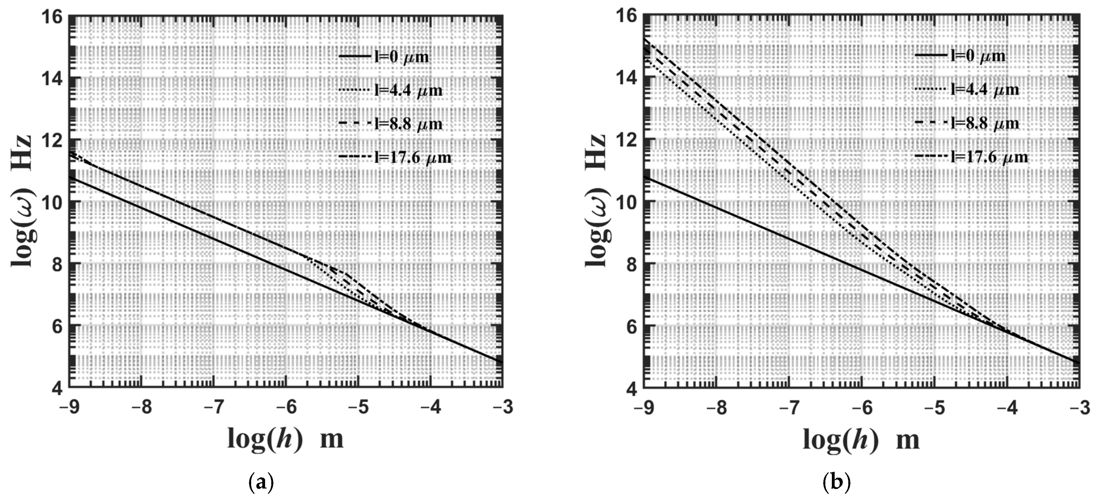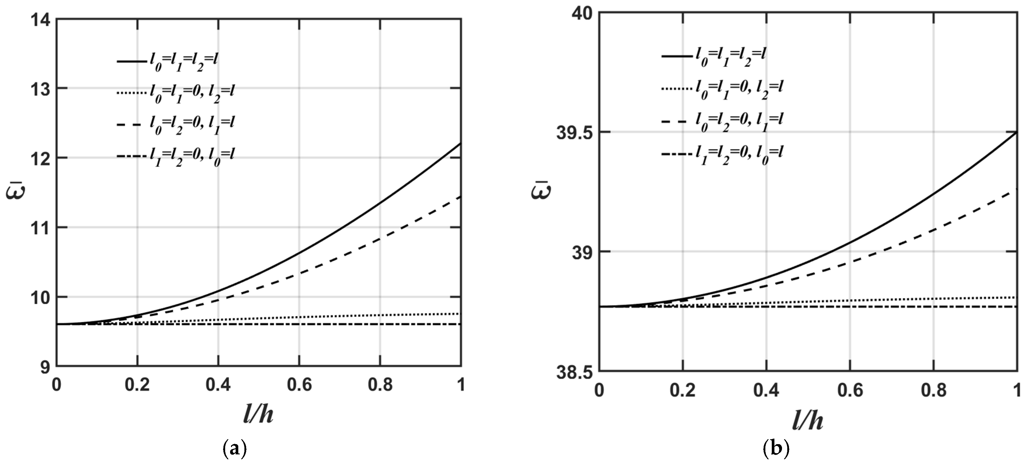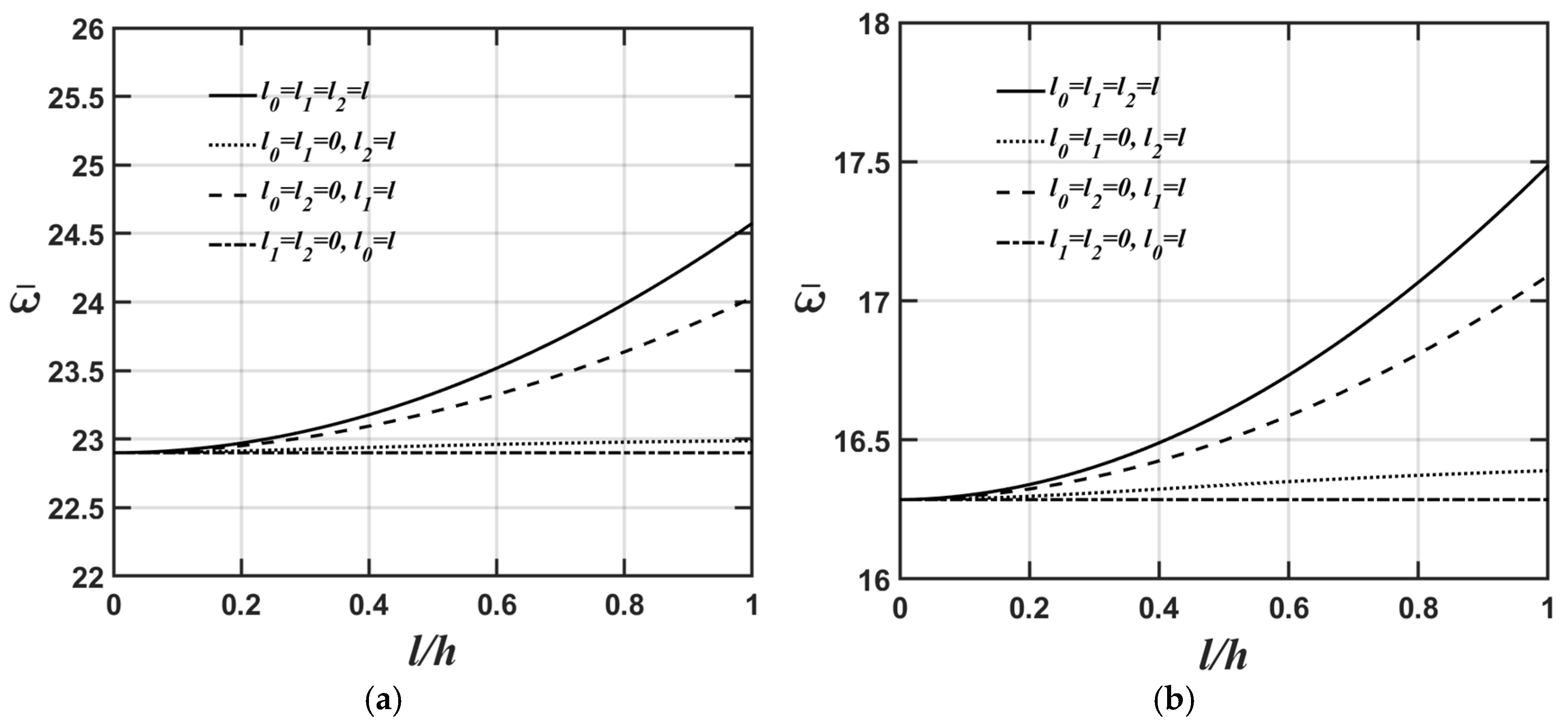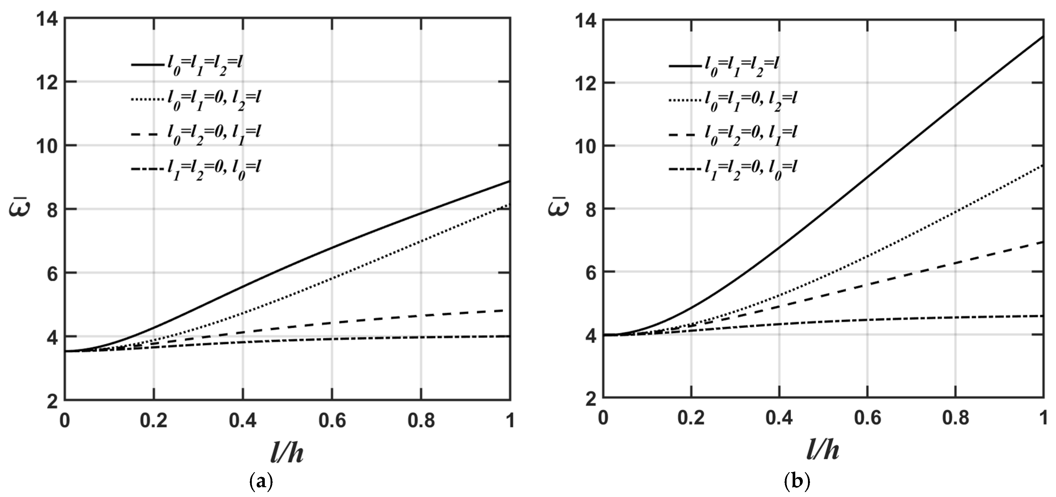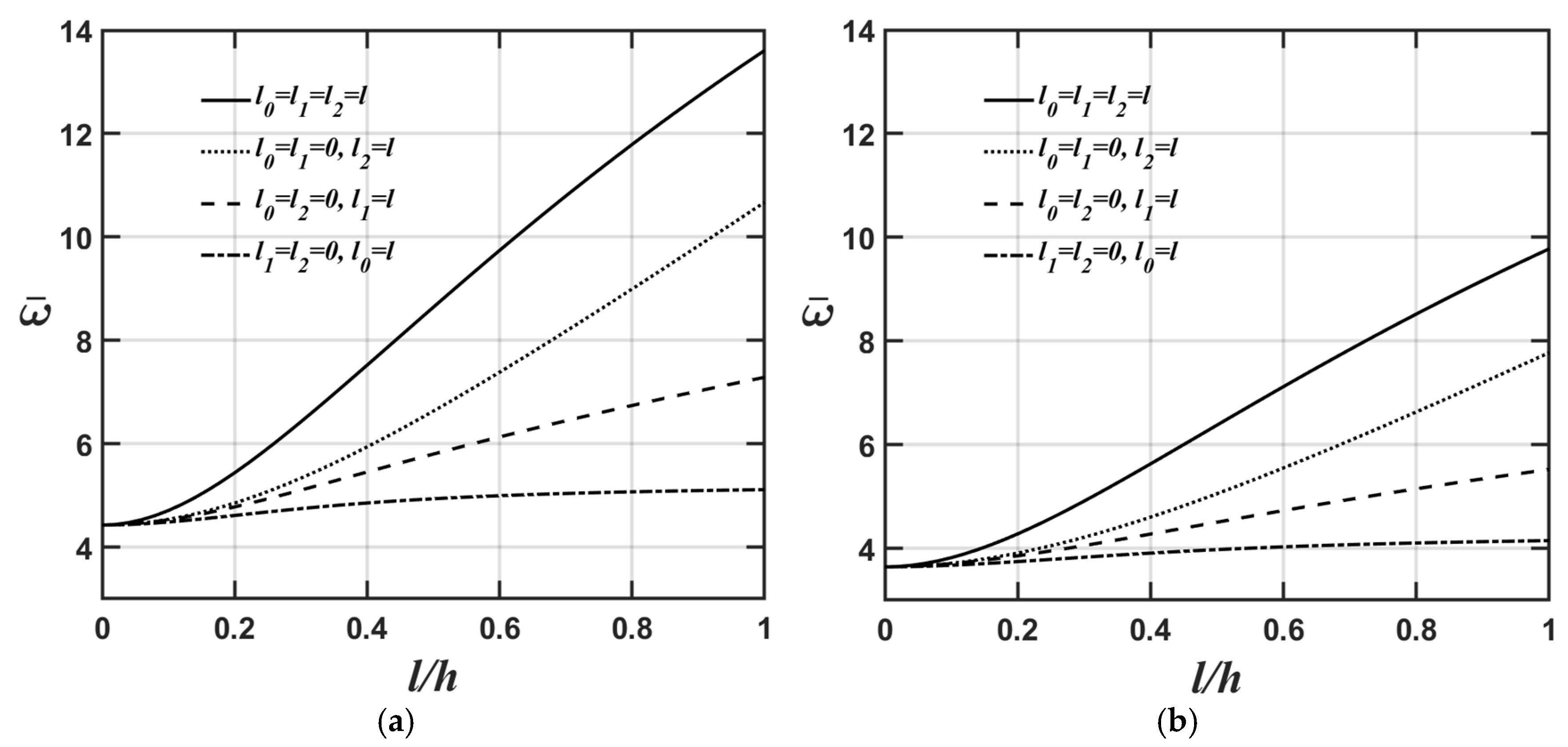 - The impact of the material length-scale parameter l2 on the lowest natural frequency of the microplate’s flexural mode becomes saturated when its thickness is less than ; conversely, the effects of the dilatational and deviatoric strain gradients consistently influence the microplate’s lowest natural frequency in its flexural mode.