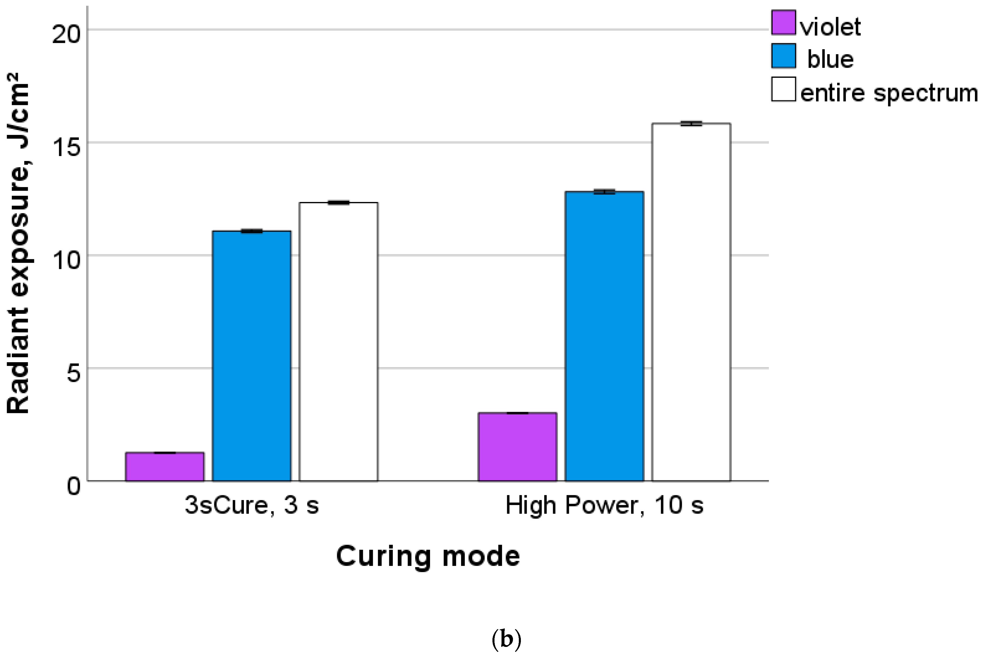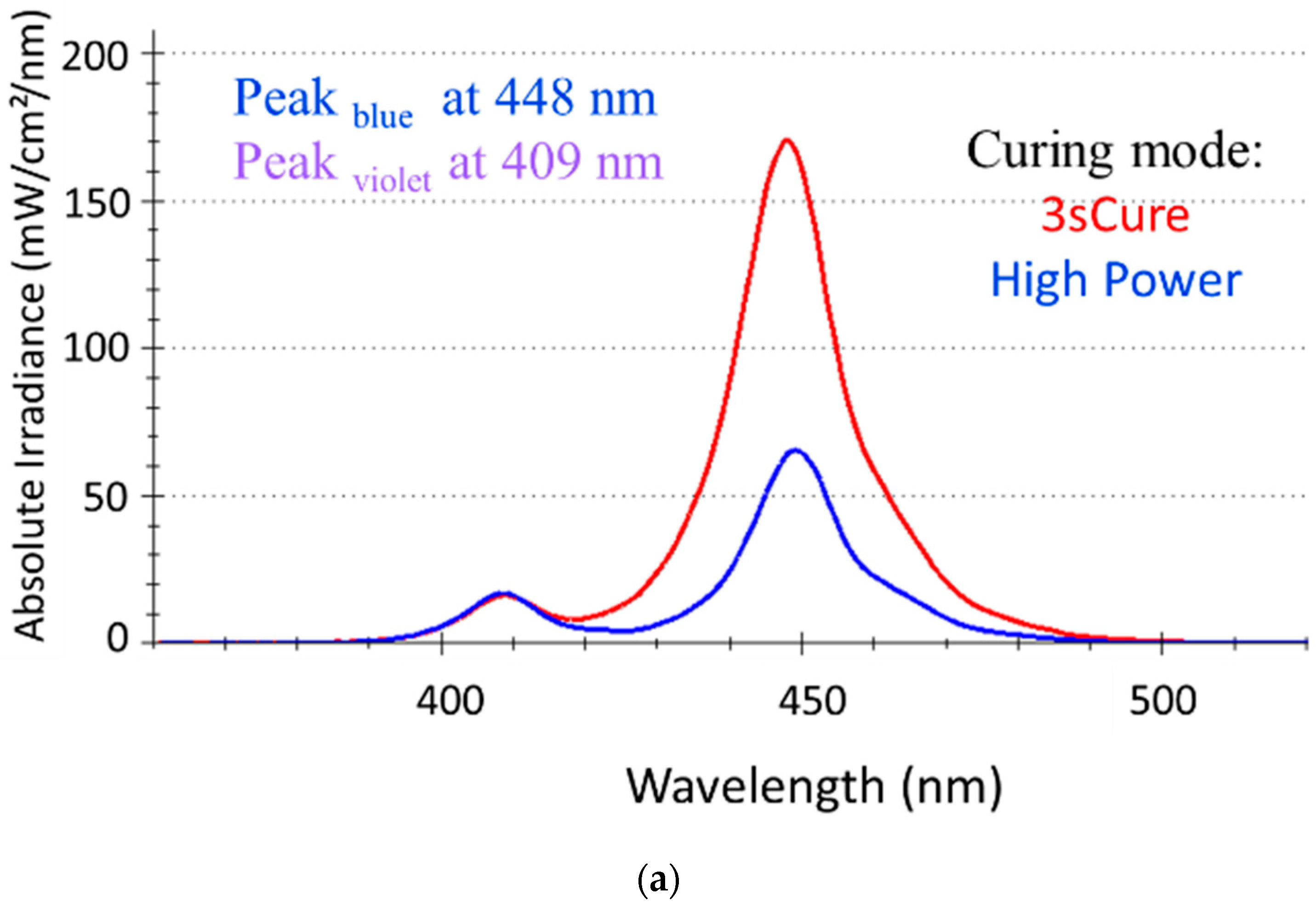 - Fernández Godoy, E.; Chaple Gil, A.; Caviedes Thomas, R.; Bersezio Miranda, C.; Martín Casielles, J.; Rodríguez Martínez, G.; Angel Aguirre, P. Efficiency and limitations of polywave light-curing units in restorative dentistry: A systematic review. Clin. Oral. Investig. 2025, 29, 384. [Google Scholar] [CrossRef] [PubMed]