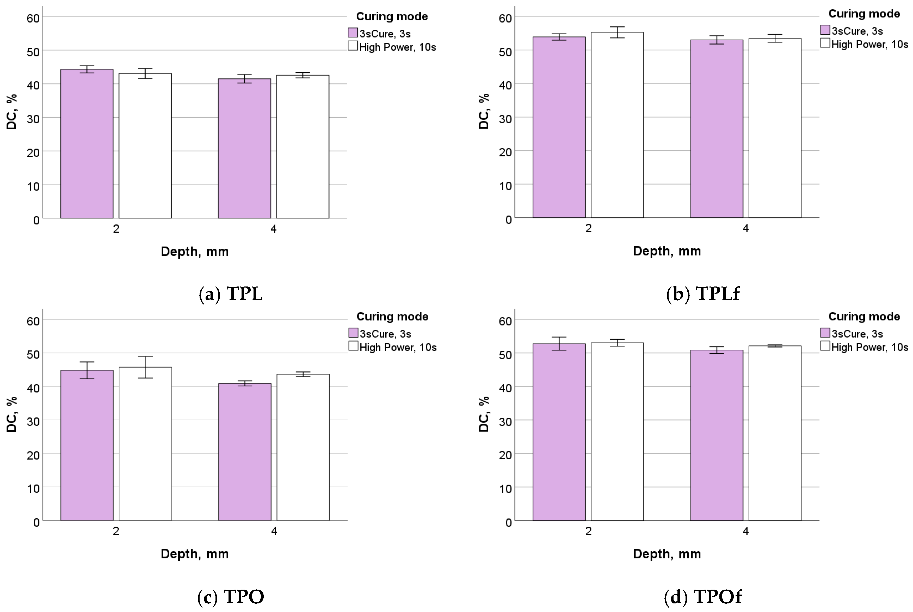 2.2.2. ATR-FTIR Spectroscopy: Degree of Conversion (DC)