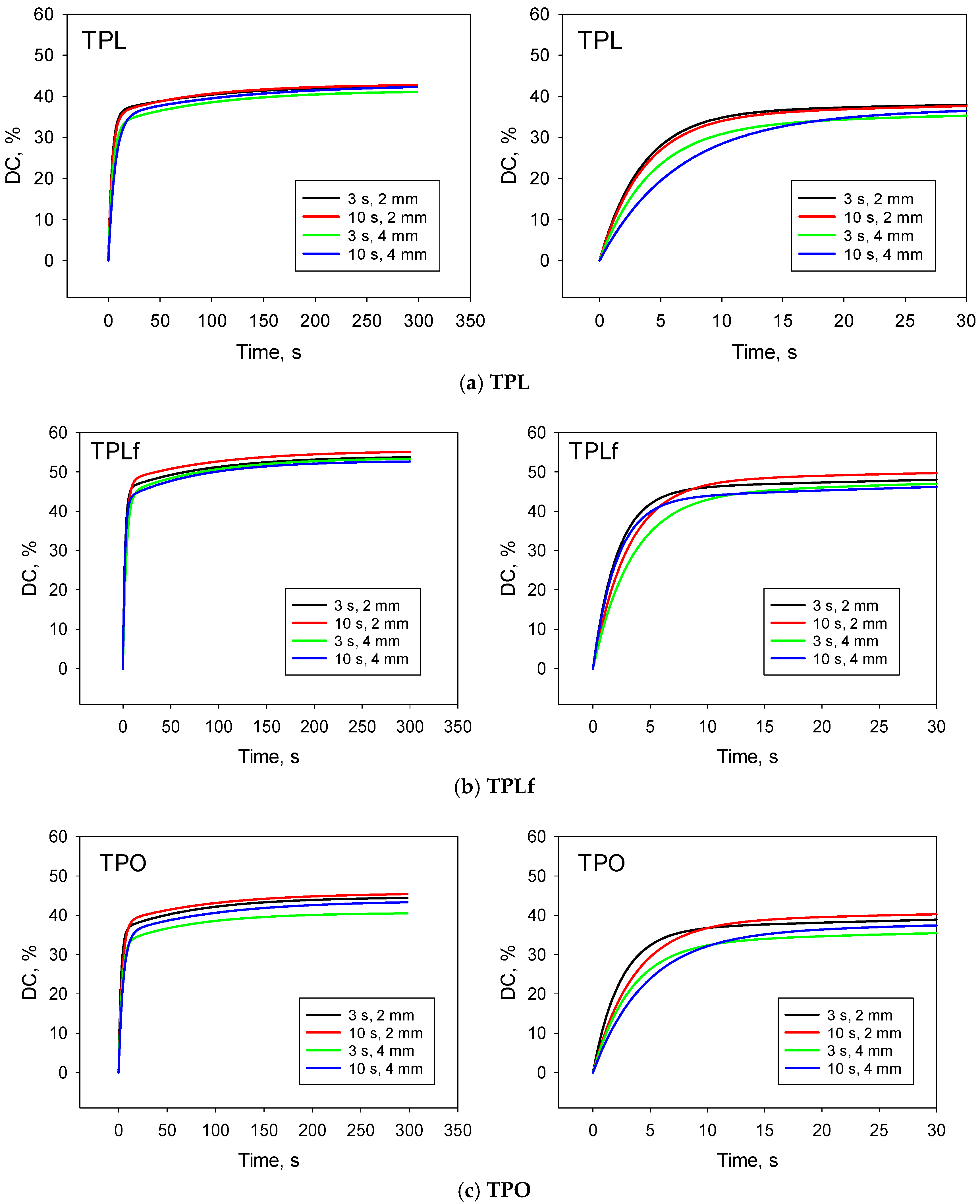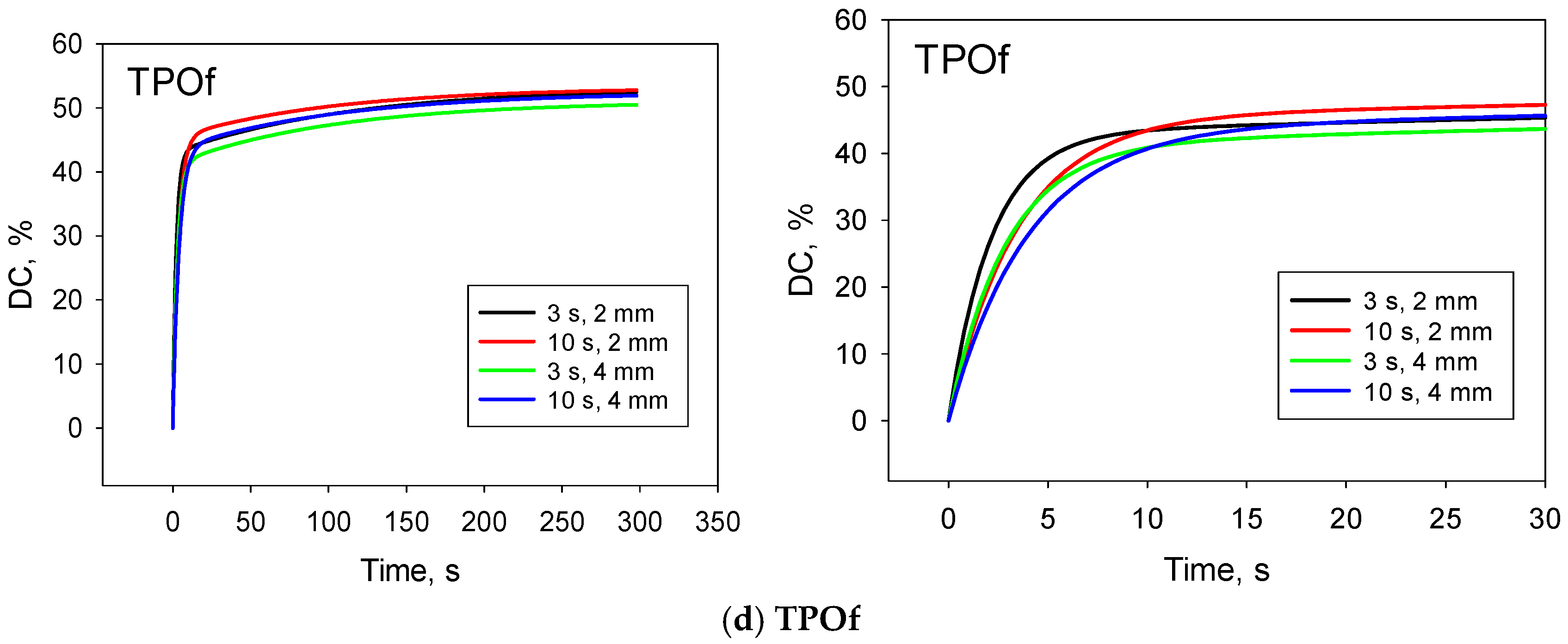 3.2. Degree of Conversion (DC) and Kinetic of Polymerisation