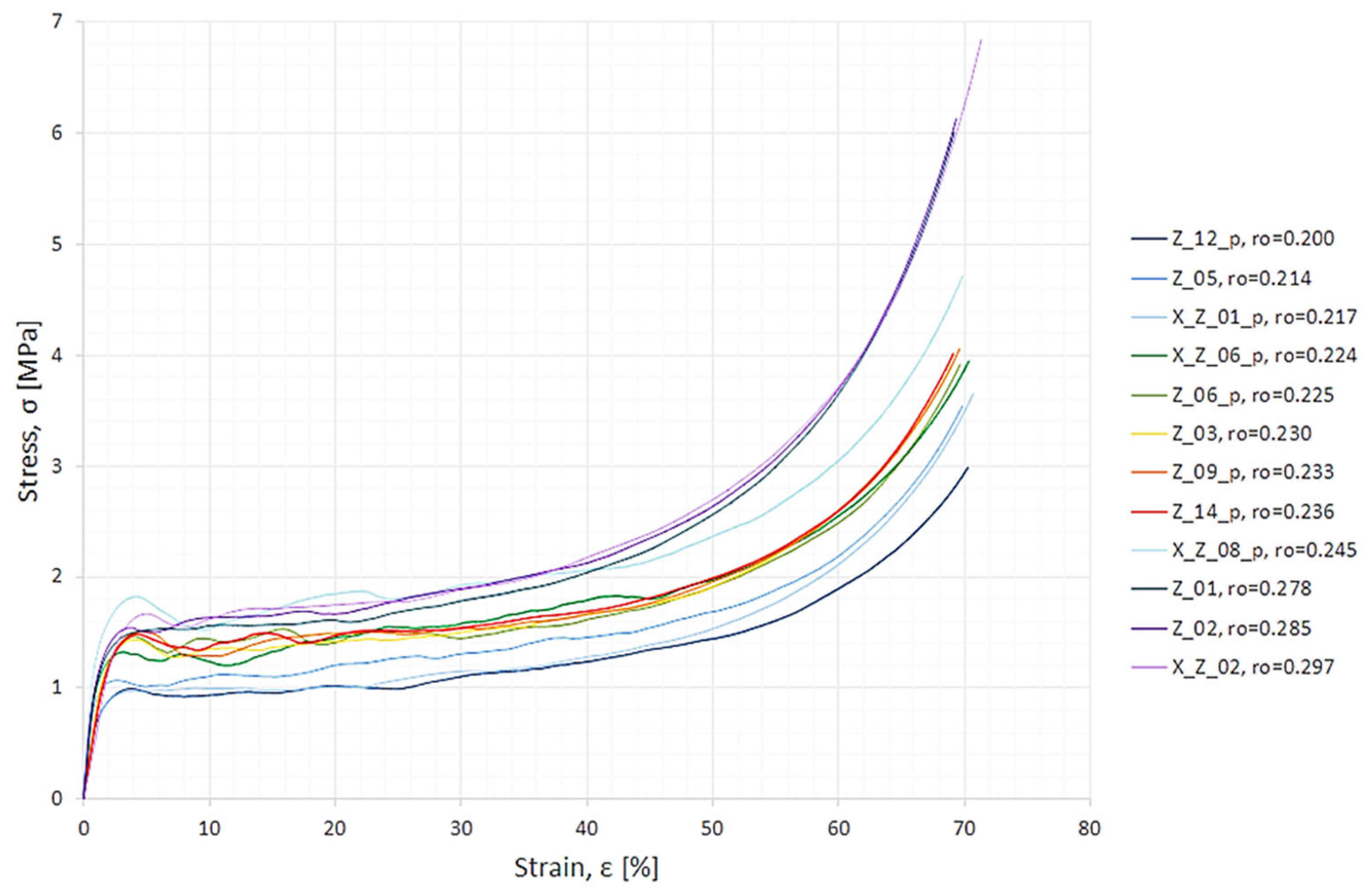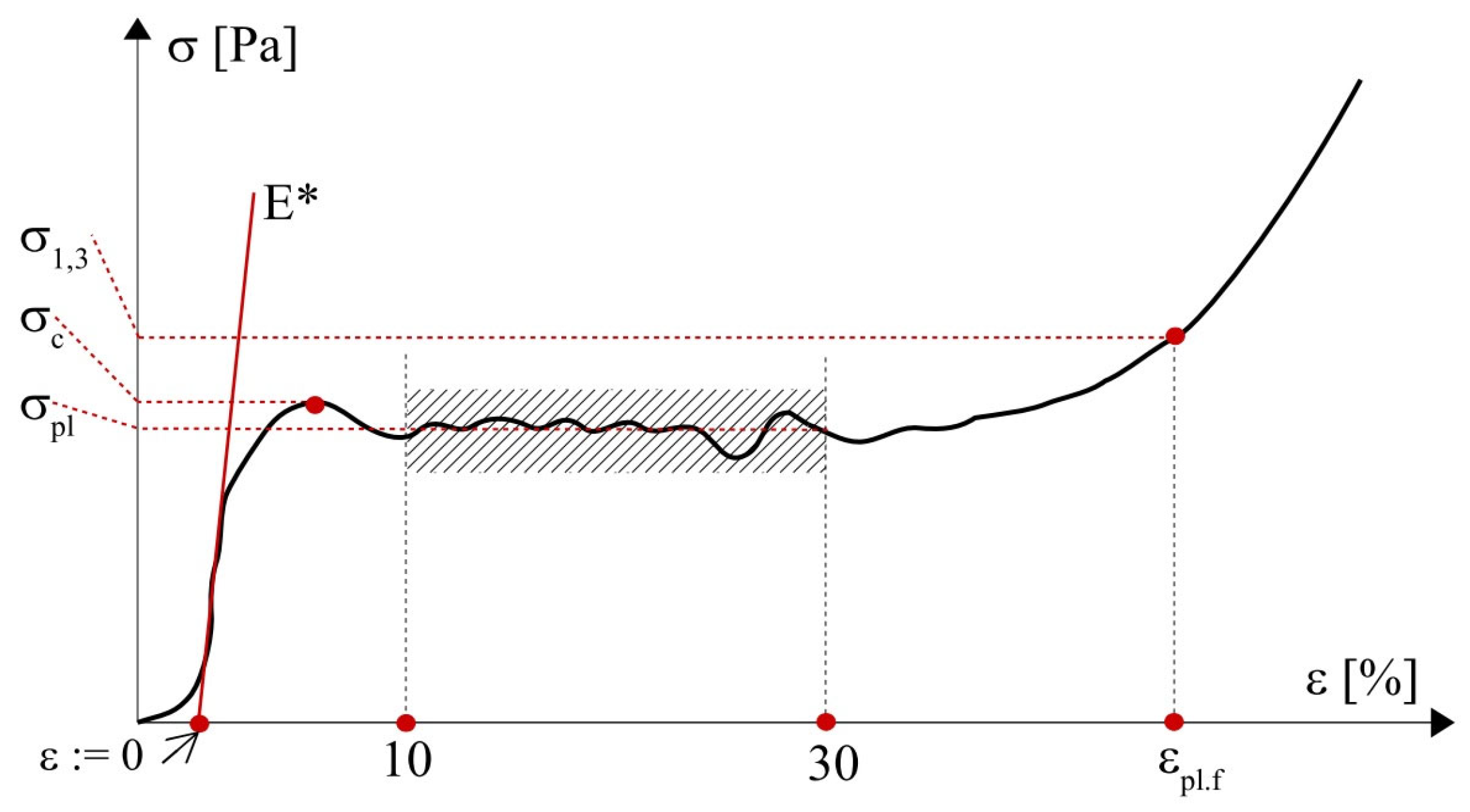 - —plateau stress—calculated as the arithmetic mean of plateau stresses; here assumed for stresses corresponding to strains in the range of 10–30%.