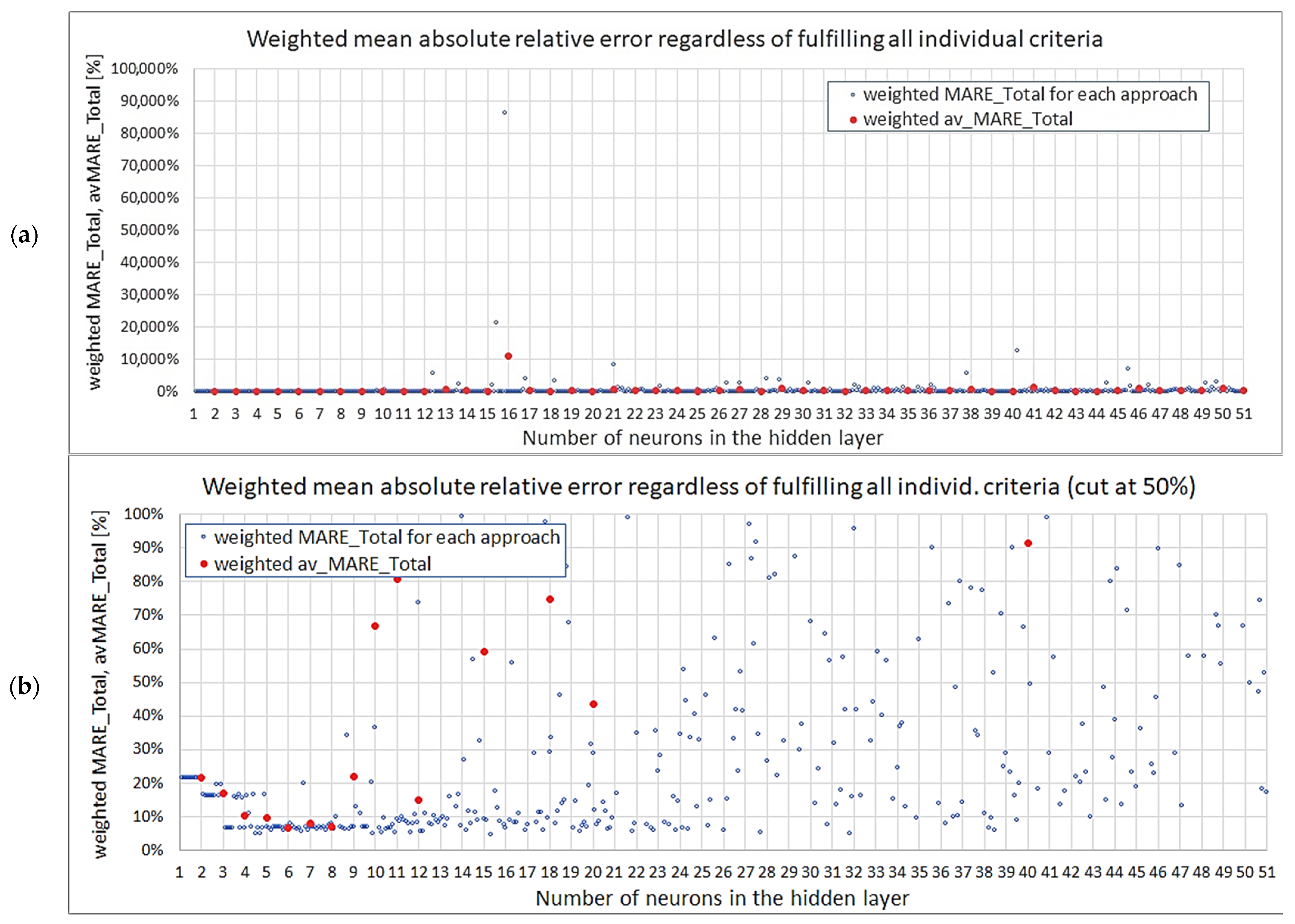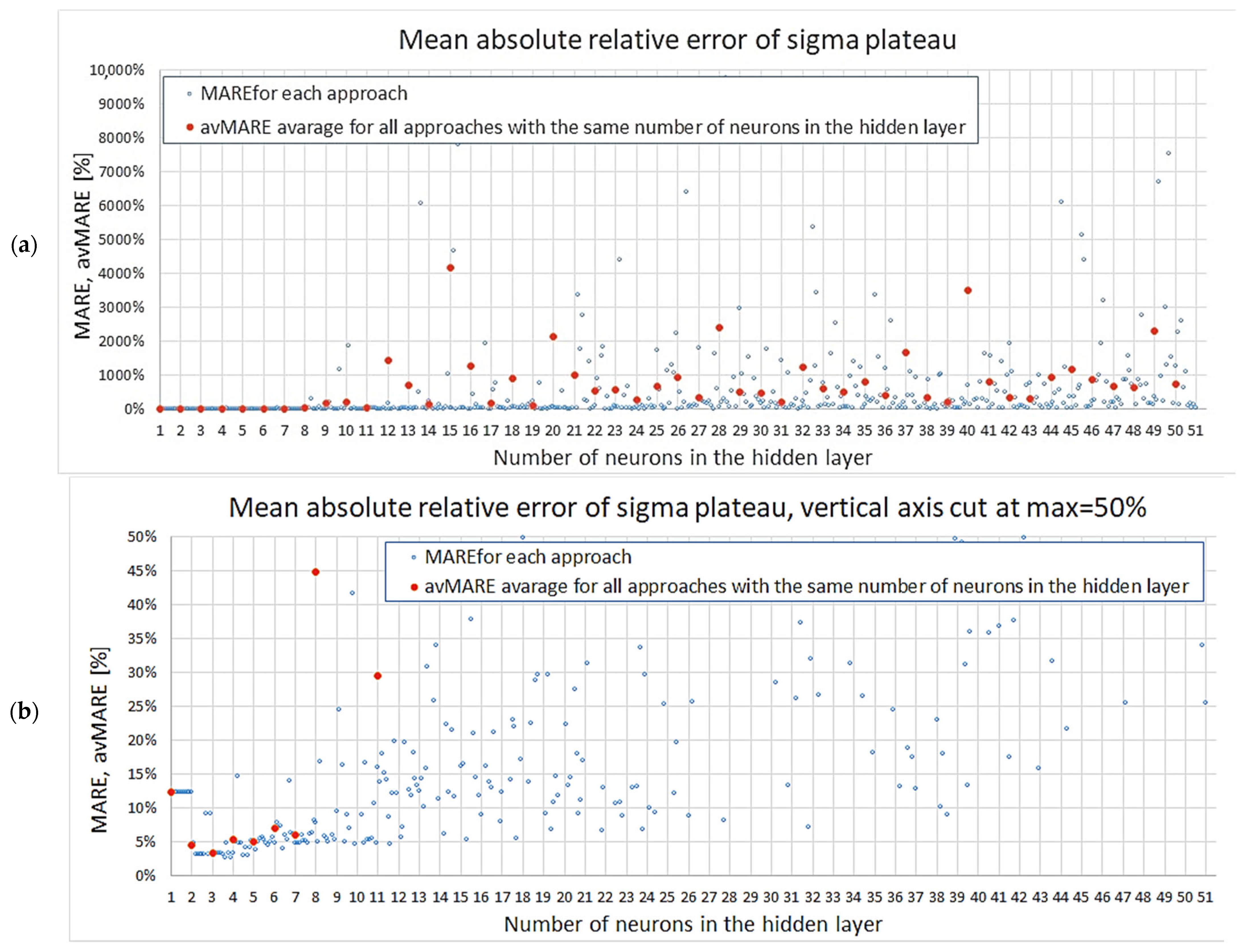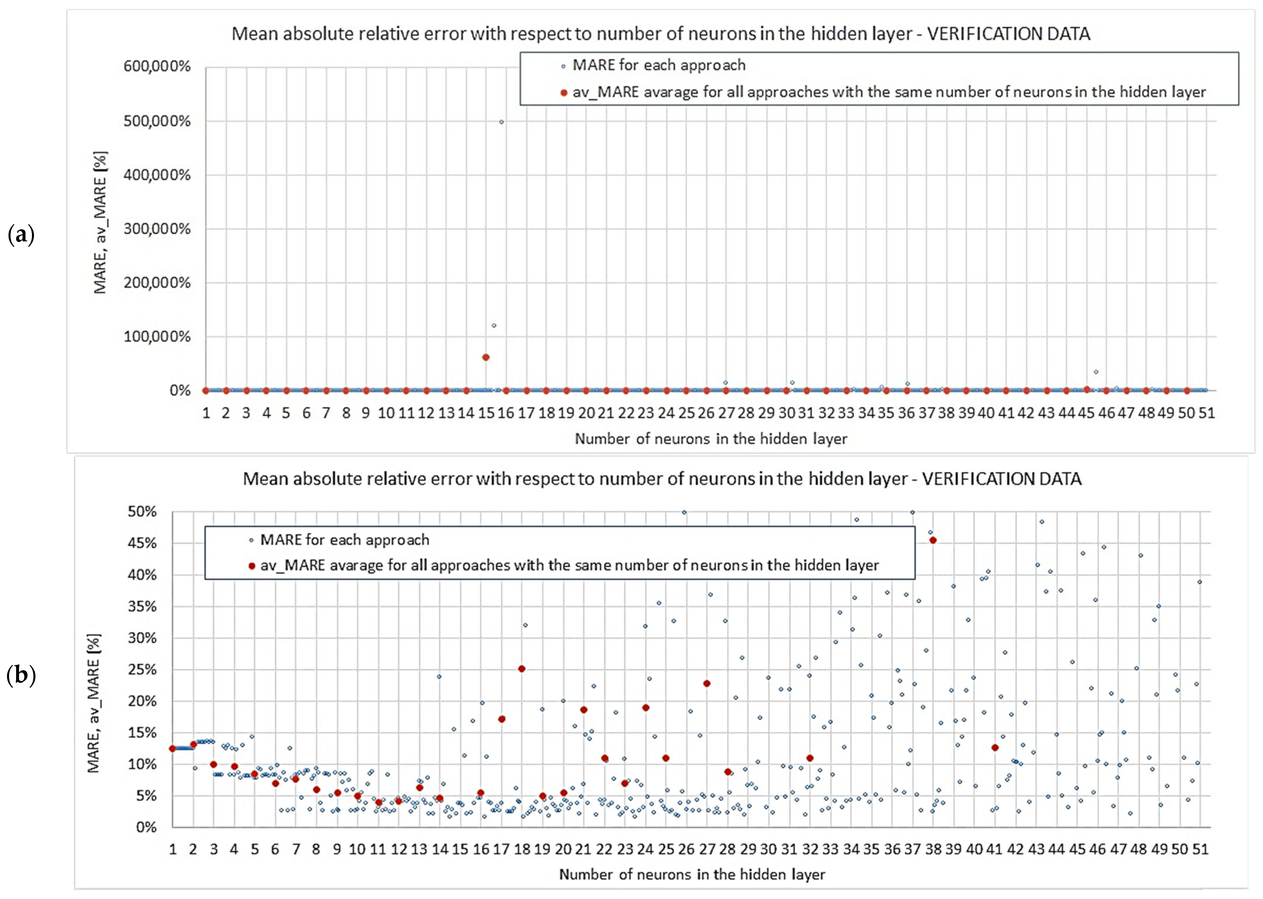 - —mean absolute relative error at the testing stage or respectively at the verification stage,