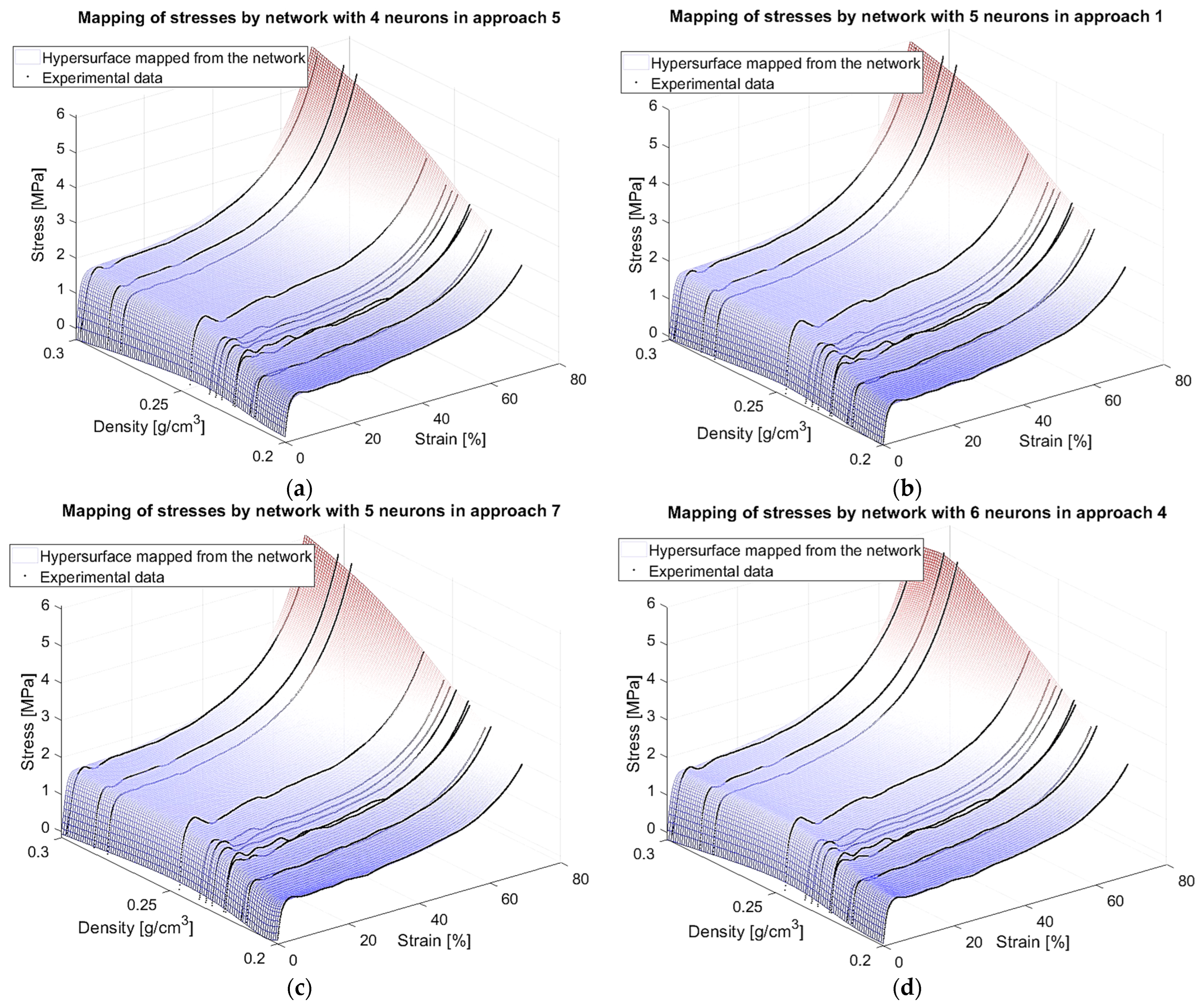 - Introduction of network quality assessment criteria that were connected with mechanical properties (plateau stress and quasi-static elastic gradient), which enabled the evaluation of networks’ extrapolation capability and finding the best model.