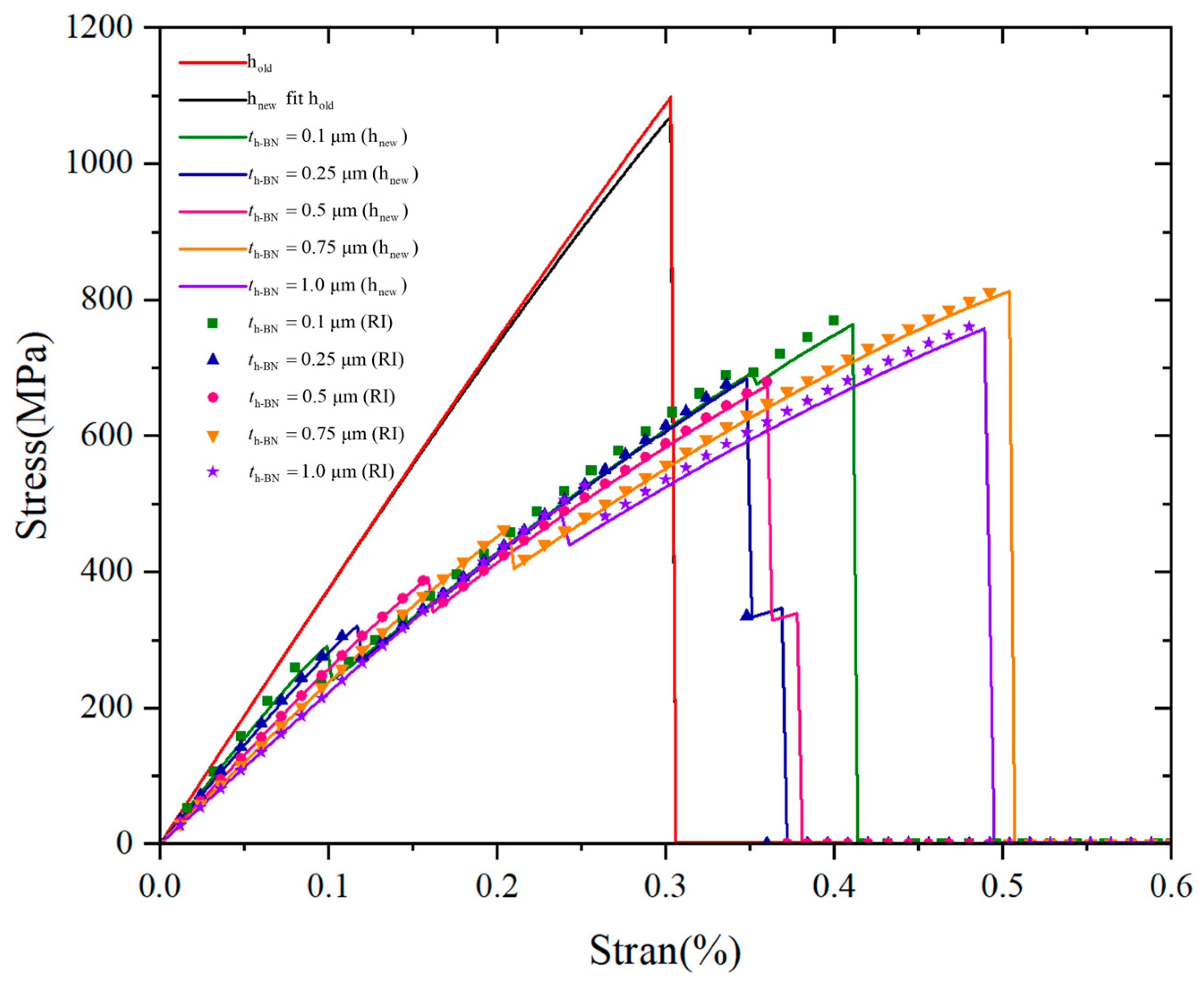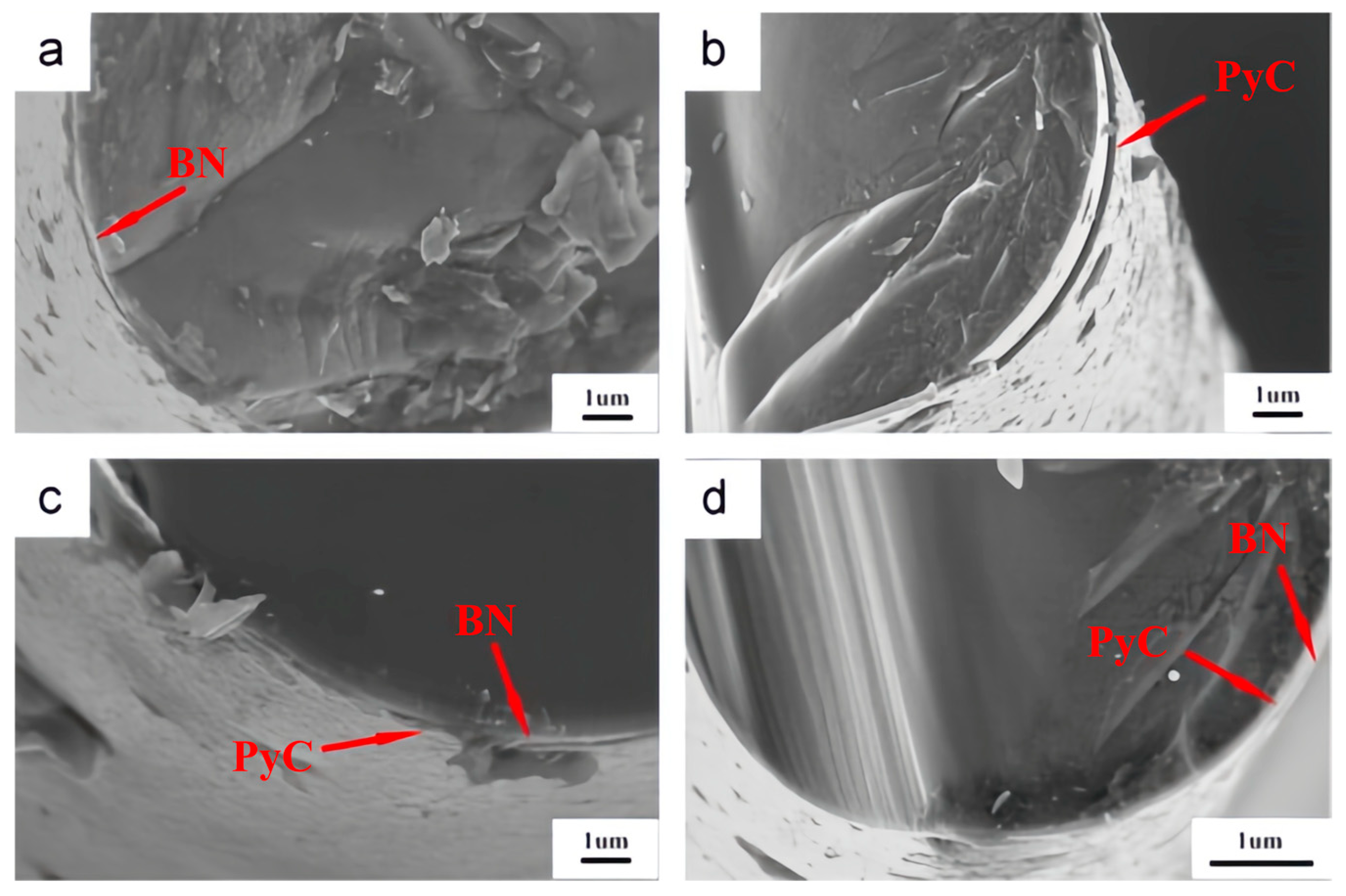 - Zhang, Y.; Hu, J.; Dong, S.; Li, Y. Influence of the thickness of pyrolytic carbon interphase on the mechanical behavior of SiC/(BN/PyC)/SiC composites. Ceram. Int. 2024, 50, 22085–22093. [Google Scholar] [CrossRef]