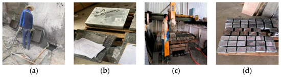Fabrication of HPSC specimens: (a) spraying-forming; (b) demolding and curing; (c) cutting of specimens; (d) specimen completed.