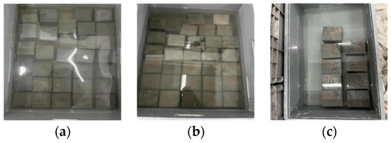 The indoor long-term soaking scheme was adopted in the experiment: the soaking solutions were 10% Na2SO4 solution, 10% Na2SO4 + 5% NaCl composite solution, and clear water solution (Figure 2). The soaking age was set to 30 d, 120 d, 180 d, 210 d, 240 d, 270 d, 300 d, and 360 d. During the test, the pH value of the soaking solution was measured every 7 days, and the pH value was adjusted to near neutral. The soaking solution was uniformly replaced every 30 days.