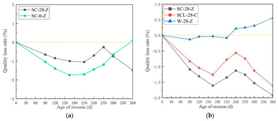 Variation of mass change rate of HPSC with corrosion age: (a) different conservation times; (b) different erosion solutions.