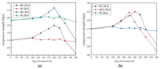 Variation of compressive strength of HPSC with corrosion age: (a) different erosion directions; (b) different erosion solutions.