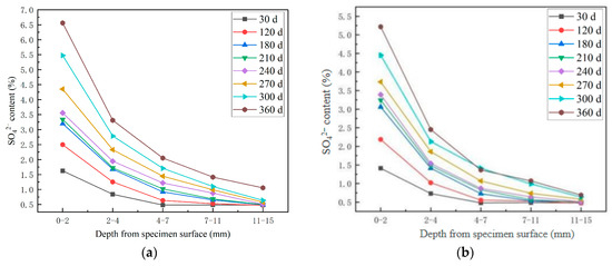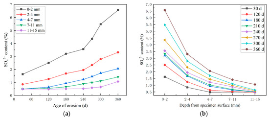 Distribution curve of sulfate content of HPSC with erosion depth under different erosion directions: (a) frontal erosion of SO42− along the spray surface; (b) lateral erosion of SO42− along the spray surface.