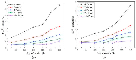 Distribution curve of sulfate content of HPSC with age under different corrosion solutions: (a) SO42− solution; (b) SO42− and Cl− composite solution.