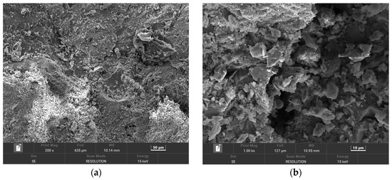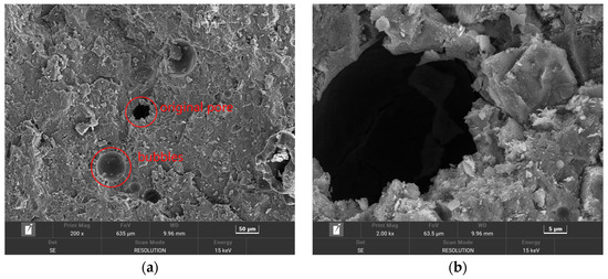 In order to make the microstructure of HPSC in different erosion solutions have obvious contrast, HPSC immersed in sodium sulfate solution alone and sulfate–chlorine salt composite solution were selected for electron microscope scanning tests. The microstructure of HPSC with erosion cycles of 0 d, 180 d, and 360 d is given below, using scanning electron microscopy (Figure 8 and Figure 9) and EDS energy spectrum analysis (Figure 10).