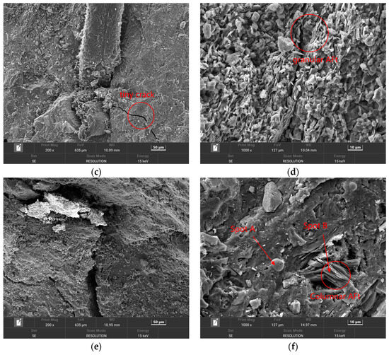 In Figure 9c,d, we can see that compared with before erosion, it can be clearly seen that the surface flatness of HPSC decreased after 180 days of erosion, and the concrete matrix began to loosen and fester, and a small amount of erosion products appeared on the surface. Compared with the local amplification diagram (Figure 8d and Figure 9d), the erosion products generated after 180 days of sulfate–chloride mixed solution erosion were significantly less than those after 180 days of sulfate erosion. This is because in the composite salt solution environment, Cl− will always react with the cement hydration products inside the concrete, and the corrosion products generated by Cl− itself will compact the inside of the concrete to prevent the entry of SO42−. This also verifies the relevant degradation rules of HPSC macroscopic mechanical properties and ion diffusion. It can be seen from Figure 9b,c that a large amount of Friedel’s salt and cauliflower-like ettringite were generated inside HPSC after 360 days of erosion in sulfate–chloride mixed solution. These erosion products will accumulate in most of the cracks and pore structures inside the specimen and then show the expansion of original cracks and the increase in new micro-cracks. The compactness of concrete decreases, and a large number of salt crystals appear at the cracks. Comparing the micro-morphology of sulfate attack at the same age, it can be seen that ettringite exhibits a large cluster-like and rod-like interwoven structure under sulfate attack (Figure 8e,f). After sulfate–chloride coupling erosion, ettringite is mainly in block and cauliflower shapes (Figure 9b,c), and ettringite and Friedel’s salt are interwoven together. This is because under sulfate attack, a large amount of ettringite is formed by the reaction between a large amount of SO42−, and the hydration of cement in concrete gradually accumulates. Cl− in the composite solution will affect the reaction between SO42− and concrete.