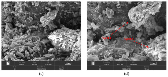 It can be seen from Figure 10 that in Figure 8f, A and B are ettringite and hydrated calcium silicate, respectively. According to the growth shape of ettringite, it can be seen that they are intertwined, interspersed, and filled with the whole pores and cracks. Under the long-term immersion of sulfate solution, due to the cracking of concrete, SO42− is more likely to erode into the interior of concrete in the later stage of erosion, and it continues to develop in pores and cracks to generate more ettringite crystals. With the increase in ettringite crystals, the volume expansion gradually develops into a large piece of coarse rod shape, which in turn promotes the development of cracks. It can be seen from c and d in Figure 10 that the products generated by HPSC after long-term immersion in sulfate-chloride salt are ettringite and Friedel’s salt. With the increase in erosion time, the generated corrosion products will gradually fill the interior until new cracks are generated, or old cracks are expanded, which further provides channels for corrosive ions until the concrete test block is completely degraded.