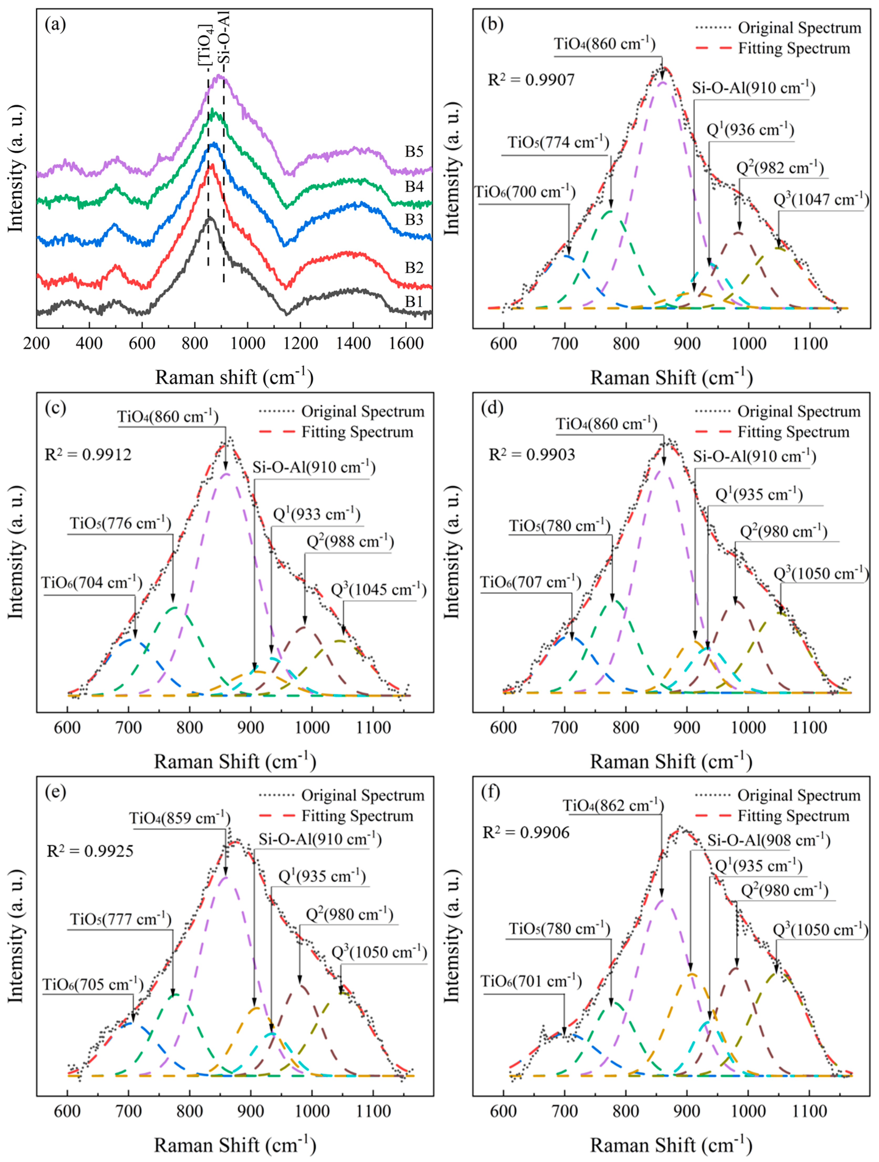 6] exhibited a progressive augmentation. Concurrently, the Si–O–Al structure also witnessed a gradual increment, which led to the broadening of the Raman spectrum peak within the range of 600–1150 cm