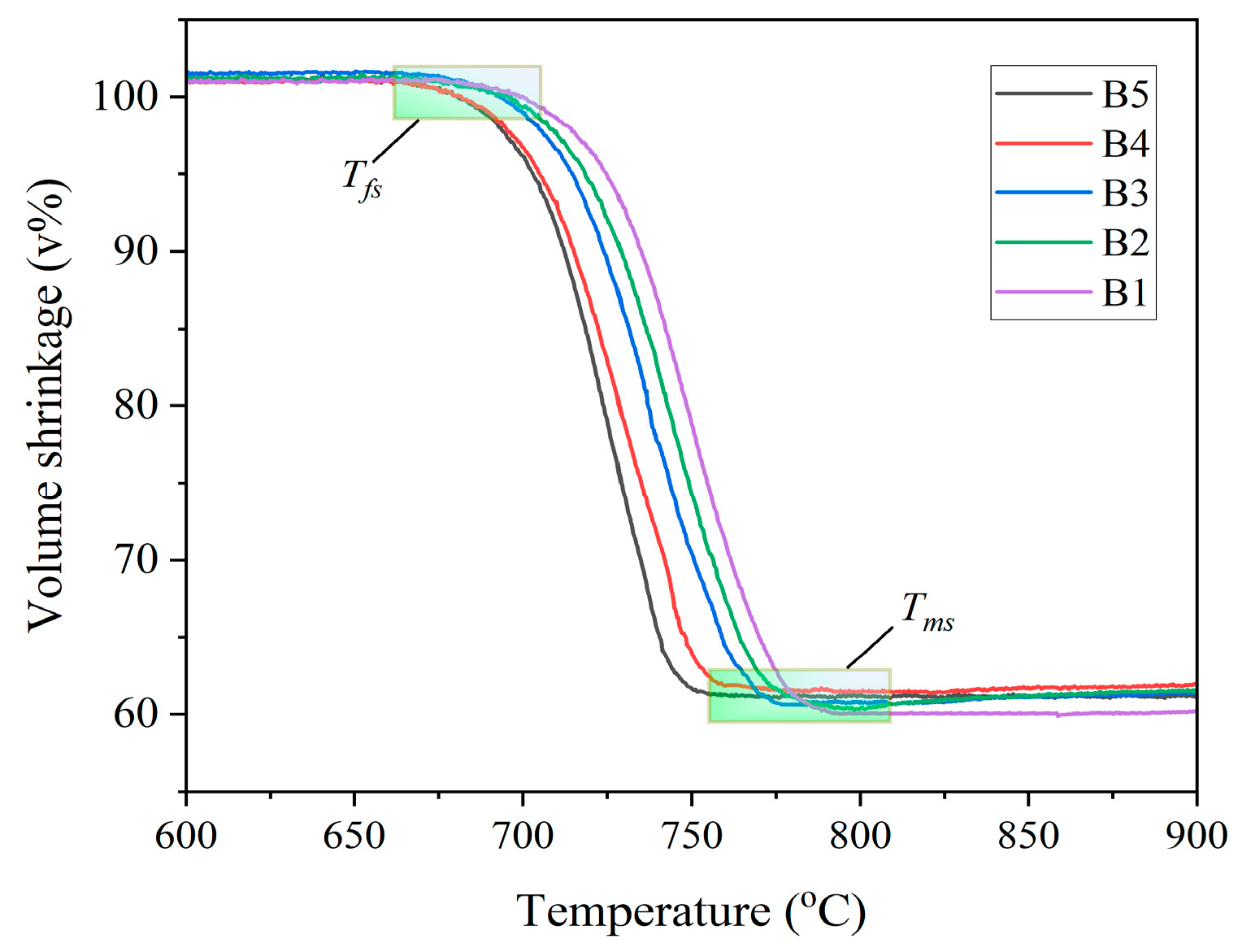 Tp2 in B2-B5 samples. Since the sintering endothermic peak of B2 and the exothermic peak of T