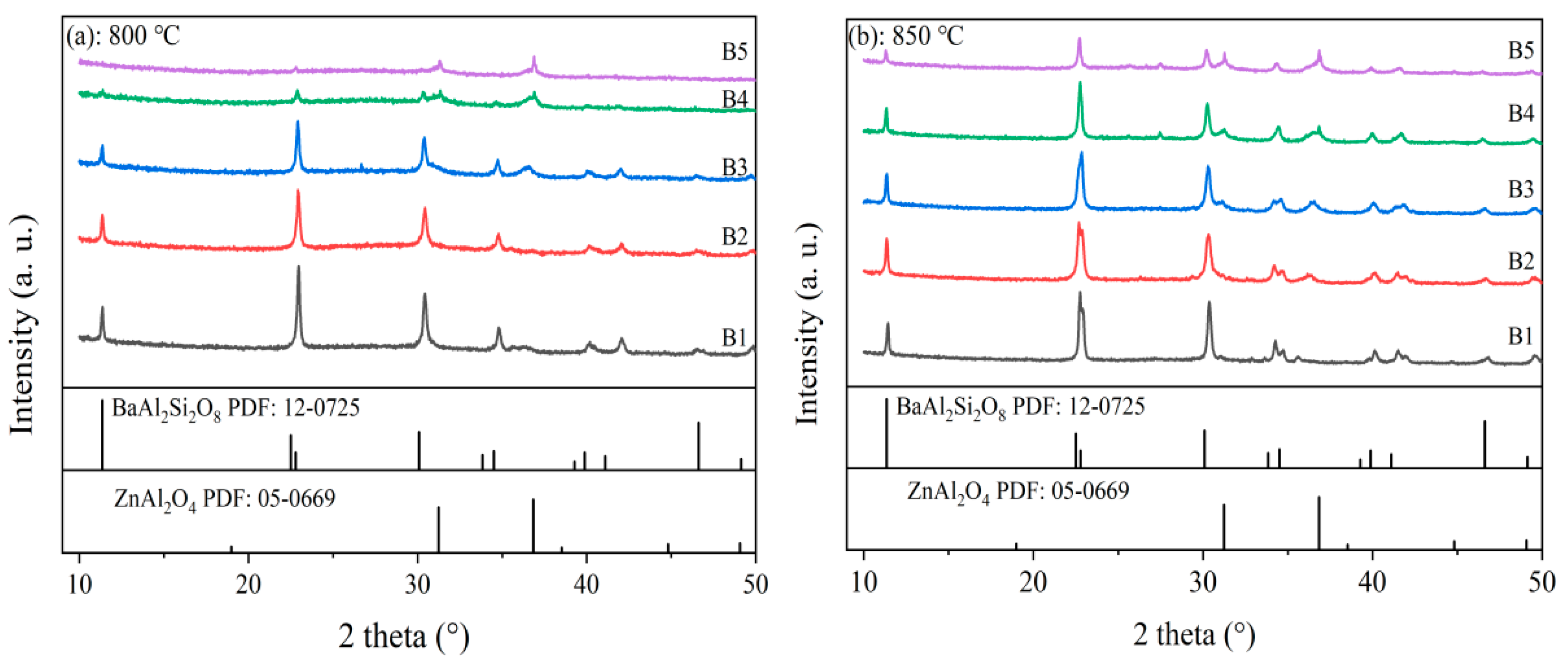 4 crystal standard card. Similarly, at 850 °C sintering, the XRD patterns of samples B2, B3, B4, and B5 also exhibited such diffraction peaks. This phenomenon indicates that as the Al
