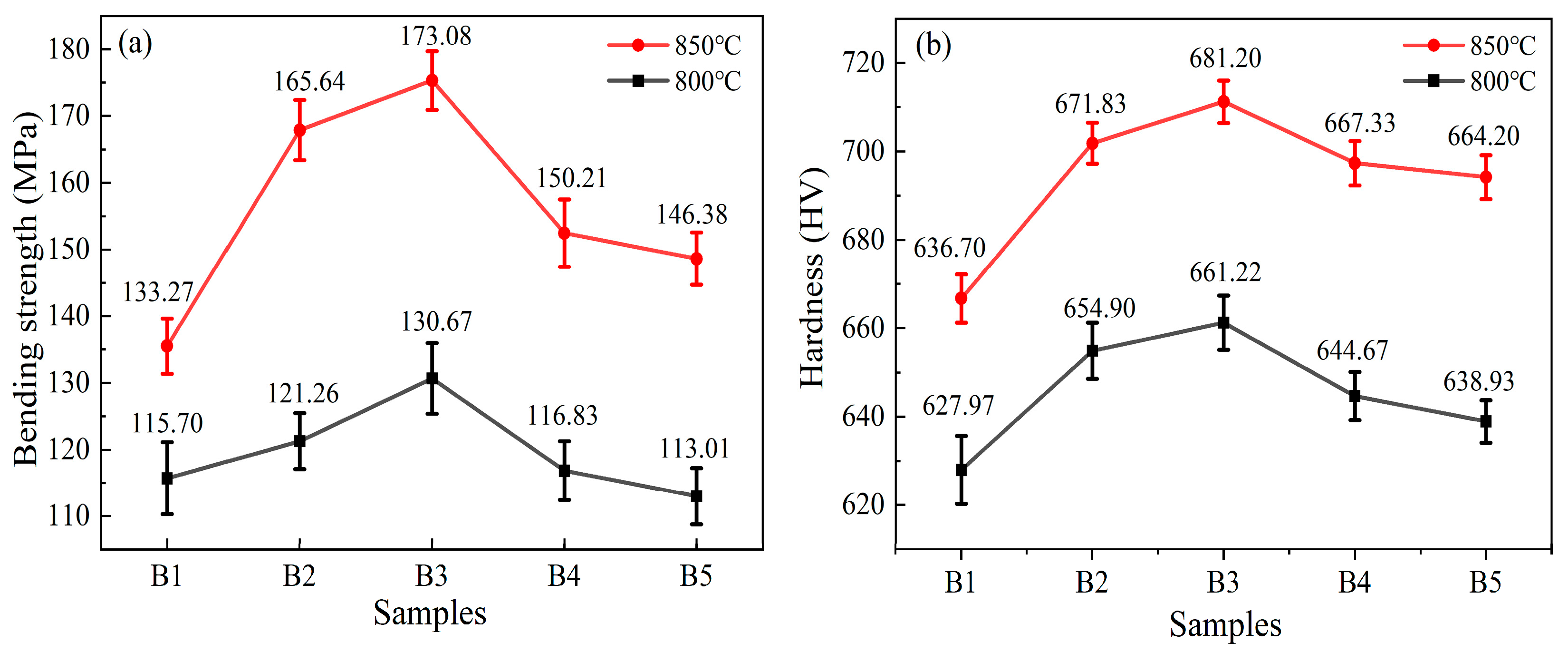 3 content rises, the flexural strength and Vickers hardness of the RBAS glass-ceramics, which are sintered at either 800 °C or 850 °C, initially increase and subsequently decrease. As the Al