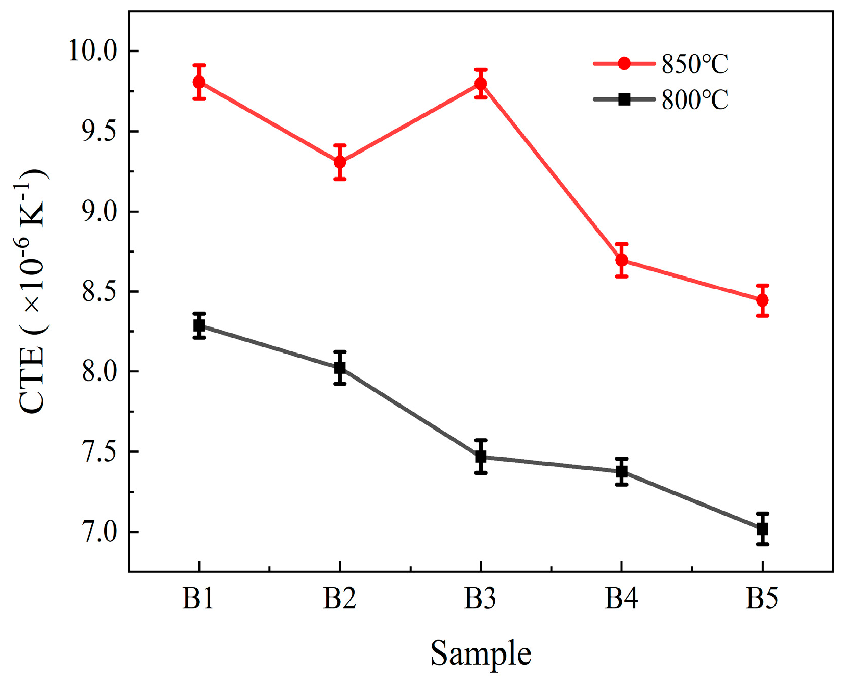 −1; after sintering at 850 °C, its CTE is 7.23–8.58 × 10