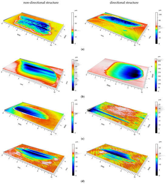 In Figure 5e, for non-directional pin structure, the grinding surface appearance is characteristic of adhesive wear mechanisms. Large furrows created in the specimen were closed by deformed and displaced material during friction. In the upper portion of the wear trace, material was elevated above the primary surface. The total abrasion depth was 0.12 mm, including height above the primary surface (0.1 mm) and wear depth (0.02 mm).