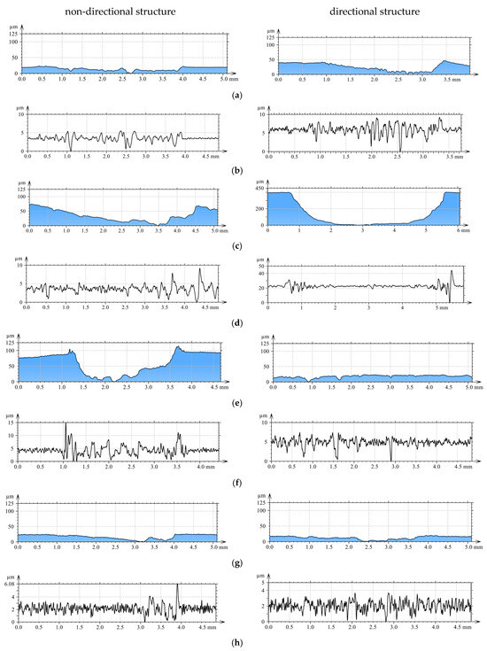 Supplementary profilometric investigations facilitated both quantitative and qualitative evaluation of wear traces developed on the examined surfaces (Figure 5). Figure 5 shows the roughness profile curve and roughness (using a 0.25 mm Gaussian filter) at a representative location of the cross-section perpendicular to the friction direction.