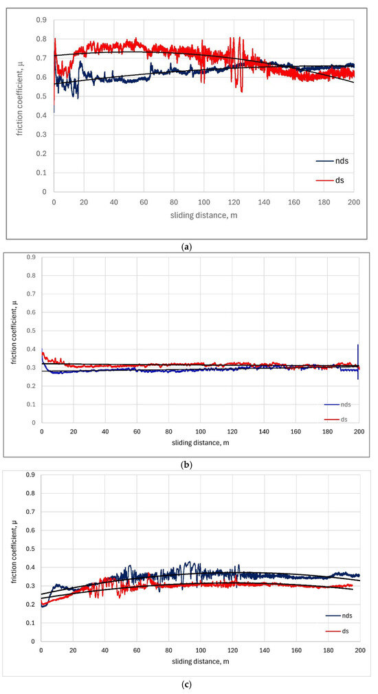 The coefficient of friction as a function of sliding distance for tested materials is shown in Figure 6. The compilation shows friction coefficient values recorded over distances from 0 to 200 m. The trend lines are marked with a solid black line.
