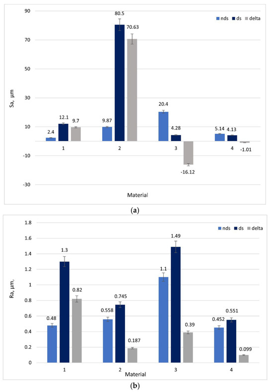 Surface roughness parameters: (a) Sa; (b) Ra values of wear tracks for tested materials: 1- Cu-ETP, 2—AlSi12CuNiMg alloy, 3—AlSi12CuNiMg + SiC composite, 4—1.3505 steel; nds—non-directional structure, ds—directional structure, delta—difference between ds-nds values.