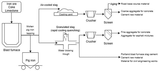 GGBFS is produced during the manufacture of pig iron in blast furnaces (Figure 3). After tapping, the molten slag is routed either to an air-cooling yard or to a water-granulation trough. Slow air-cooling followed by aging, crushing and screening yields a largely crystalline air-cooled slag, typically used as road-base, coarse aggregate for concrete, or as cement raw meal. In contrast, rapid quenching with pressurised water produces a glassy granulated slag; when sieved it can serve as fine aggregate for concrete or asphalt, and when dried and ground it becomes ground granulated blast-furnace slag (GGBFS)—a latent-hydraulic and pozzolanic binder. Thus, the cooling route and point of collection control the properties and the end use of the slag. Due to these physico-chemical characteristics, GGBFS is extensively employed as a partial substitute for ordinary Portland cement (OPC), providing environmental, economic, and technological advantages. Notably, replacement of 50% OPC with GGBFS can reduce CO2 emissions by up to 0.5 t per m3 of concrete [64].