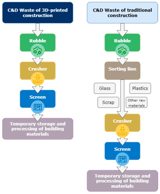 Beyond the need to ensure appropriate grading of waste-derived feedstocks, a major limitation is the risk of their inherent variability and potential contamination, and the resulting impact on mechanical properties; these factors necessitate rigorous mix-design strategies and strict quality-control measures. Sulfate-bearing gypsum residues, frequently present in fine recycled aggregates, may trigger internal sulfate attack and expansion; accordingly, standards cap water-soluble sulfate in aggregates (e.g., ≤0.2% by mass in EN 206 [101]), and best practice stresses selective demolition to avoid gypsum intrusion [102]. Adhered old mortar further elevates water absorption and porosity–often several-fold relative to natural aggregate—thereby shifting mix water demand and degrading the ITZ, which is consistently linked to strength penalties [103,104]. Impurities such as clay, gypsum/plaster, asphalt, wood, or paint have been reported to depress compressive strength even at modest contents, underscoring the need for upstream separation and contamination screening [105]. Moreover, limits on specific contaminants (e.g., bituminous/asphaltic constituents ≲ 10% by mass in EN 12620 guidance) should be combined with process controls such as moisture and absorption management (pre-saturation) and batch-wise rheology monitoring to maintain printable mixtures within the extrusion window [106,107].