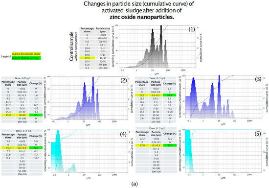 (a) Changes in particle size (cumulative curve) of activated sludge after the addition of ZnO-NPs. (1) Without addition of ZnO-NPs; (2) After addition of ZnO-NPs in dose 0.05 g/L; (3) After addition of ZnO-NPs in dose 0.1 g/L; (4) After addition of ZnO-NPs in dose 0.2 g/L; (5) After addition of ZnO-NPs in dose 0.3 g/L. (b) Changes in particle size (cumulative curve) of activated sludge after the addition of TiO2-NPs. (1) Without addition of TiO2-NPs; (2) After addition of TiO2-NPs in dose 0.05 g/L; (3) After addition of TiO2-NPs in dose 0.1 g/L; (4) After addition of TiO2-NPs in dose 0.2 g/L; (5) After addition of TiO2-NPs in dose 0.3 g/L.