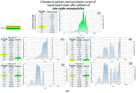 (a) Changes in particle size (cumulative curve) of water supernatant after the addition of various doses of ZnO-NPs. (1) Without addition of ZnO-NPs; (2) After addition of ZnO-NPs in dose 0.05 g/L; (3) After addition of ZnO-NPs in dose 0.1 g/L; (4) After addition of ZnO-NPs in dose 0.2 g/L; (5) After addition of ZnO-NPs in dose 0.3 g/L. (b) Changes in particle size (cumulative curve) of water supernatant after the addition of various doses of TiO2-NPs. (1) Without addition of TiO2-NPs; (2) After addition of TiO2-NPs in dose 0.05 g/L; (3) After addition of TiO2-NPs in dose 0.1 g/L; (4) After addition of TiO2-NPs in dose 0.2 g/L; (5) After addition of TiO2-NPs in dose 0.3 g/L.