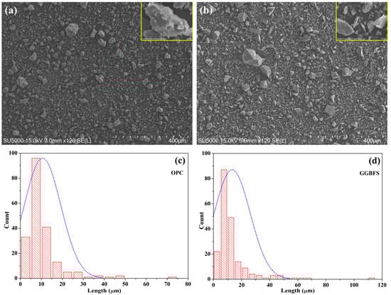 SEM images (a,b) and particle size distribution (c,d) of OPC and GGBFS.