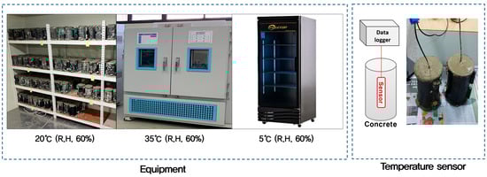 Concrete batches were prepared in accordance with Table 4. Immediately after mixing, the fresh concrete was cast into 100 mm × 200 mm cylindrical molds in two layers, each compacted using a vibrating table. The concrete cylinders were capped with gypsum in accordance with ASTM C 617 [38]. Specimens were then placed in temperature-controlled curing chambers set to 5 ± 2 °C, 20 ± 2 °C, and 35 ± 2 °C, with relative humidity maintained at 60 ± 2.5%. These conditions conformed to ASTM C39 [39] curing requirements.