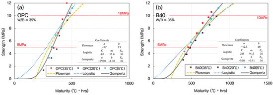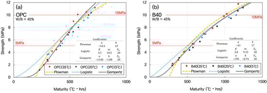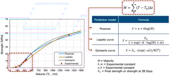 Using the maturity values calculated from the Nurse–Saul method and the determined datum temperatures, early-age compressive strength predictions were performed with three empirical models—Plowman, Logistic, and Gompertz (Table 1).