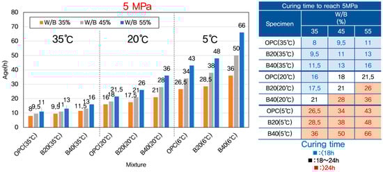 Time required to reach 5 MPa for different W/B ratios, GGBFS levels, and curing temperatures.