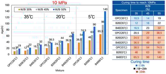 Time required to reach 10 MPa for different W/B ratios, GGBFS levels, and curing temperatures.