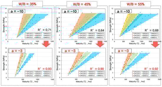 To identify the optimal datum temperature, compressive strength data for all mixes were plotted against maturity indices calculated using various assumed T0 values. Regression analysis was then performed to assess the correlation between maturity and measured compressive strength. As shown in Figure 6, for OPC mixtures, the strongest linear relationship, indicated by the highest coefficient of determination (R2), was observed when T0 was set to −3 °C. This result is consistent with values reported in the literature for ordinary cement-based concrete, particularly under cold-weather curing conditions [65].