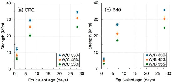 Compressive strength of concrete by GGBFS replacement ratio based on equivalent age (a) OPC and (b) GGBFS 40%.