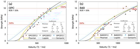 Age–strength curves were constructed for each curing temperature. Maturity–strength curves were then derived using the Nurse–Saul equation [40].