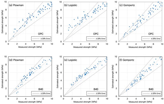Figure 11 shows a comparison between the measured and predicted strengths depending on the inclusion of blast furnace slag at early age. These results confirm that the Gompertz model is most suitable for early-age strength prediction in a variety of concrete mixtures, particularly when precision is required during the critical 5–10 MPa interval [70]. The Plowman model remains a viable alternative, especially for field applications where simplicity and speed are valued.