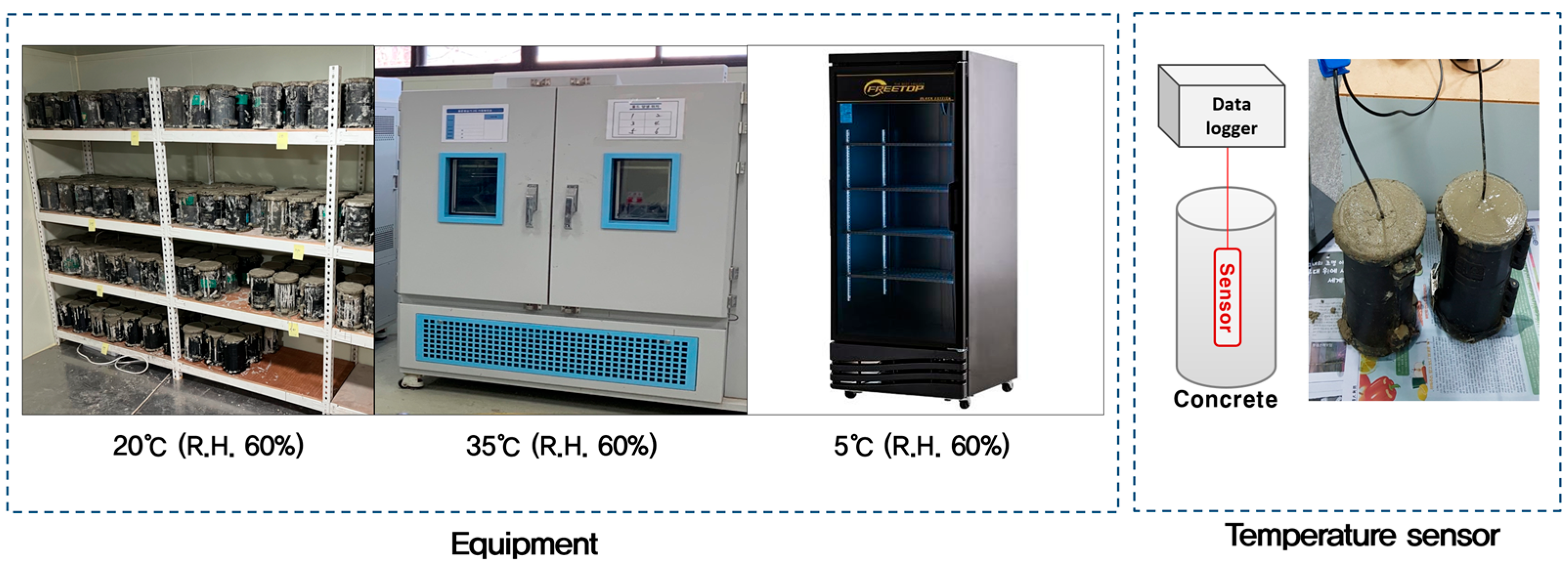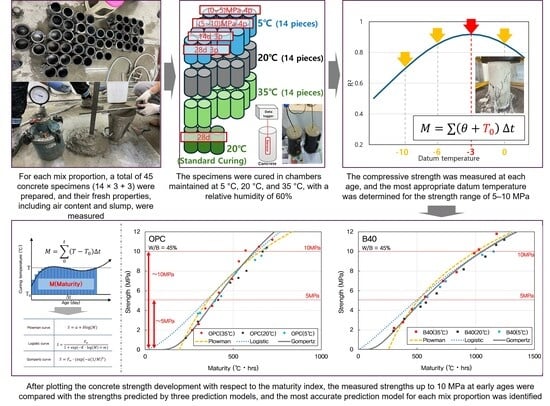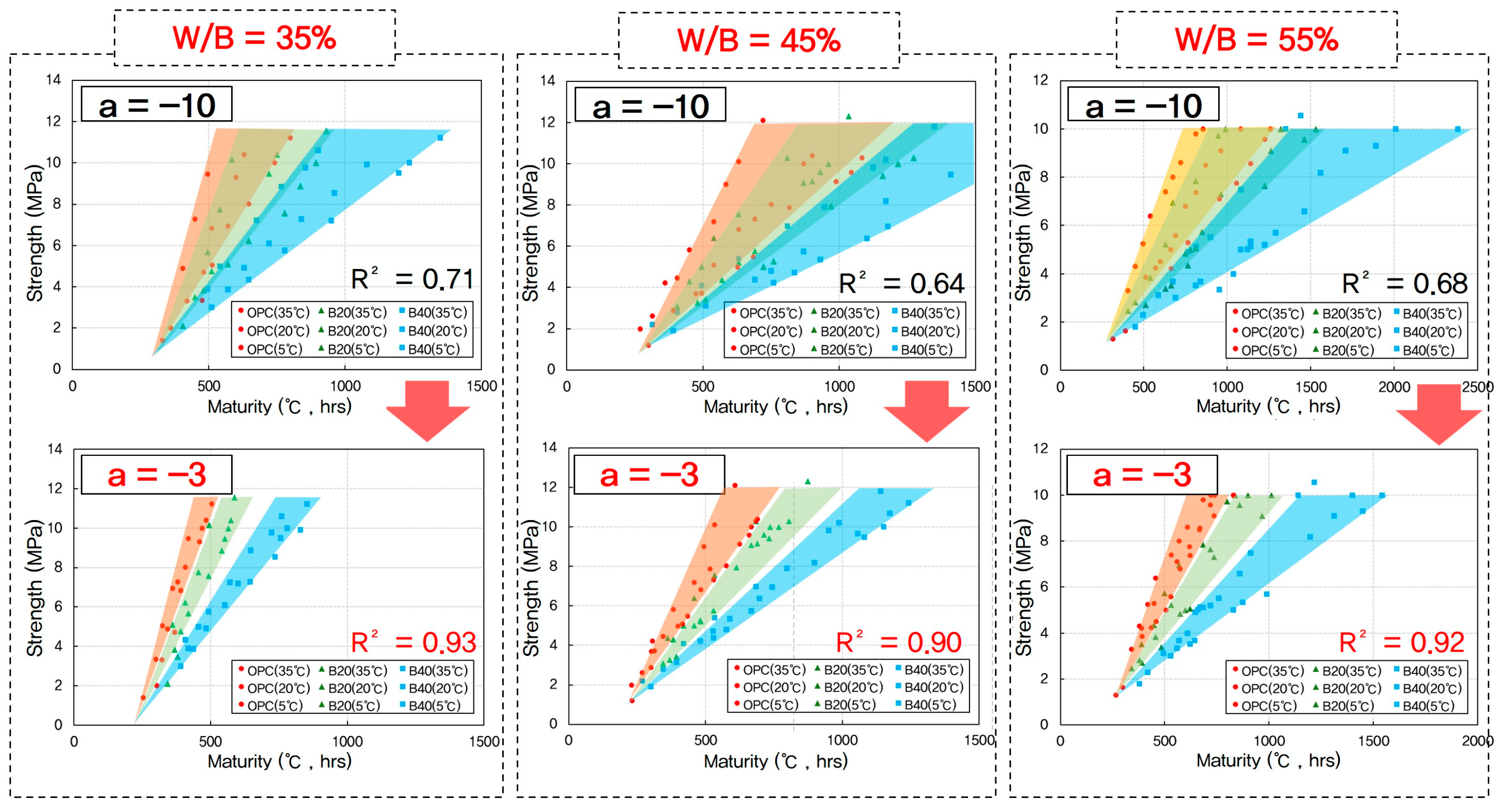 - Ryu, G.-S.; An, G.-H.; Yoon, Y.-S.; Kim, J.-Y.; Choi, S. Evaluation of Concrete Compressive Strength Prediction Using the Maturity Method Incorporating Various Curing Temperatures and Binder Compositions. Materials 2024, 17, 5794. [Google Scholar] [CrossRef]