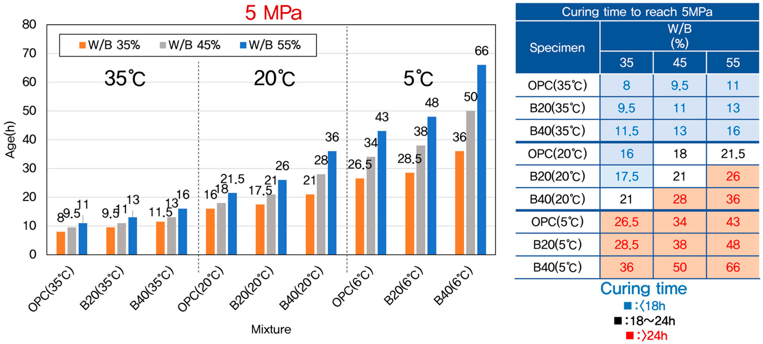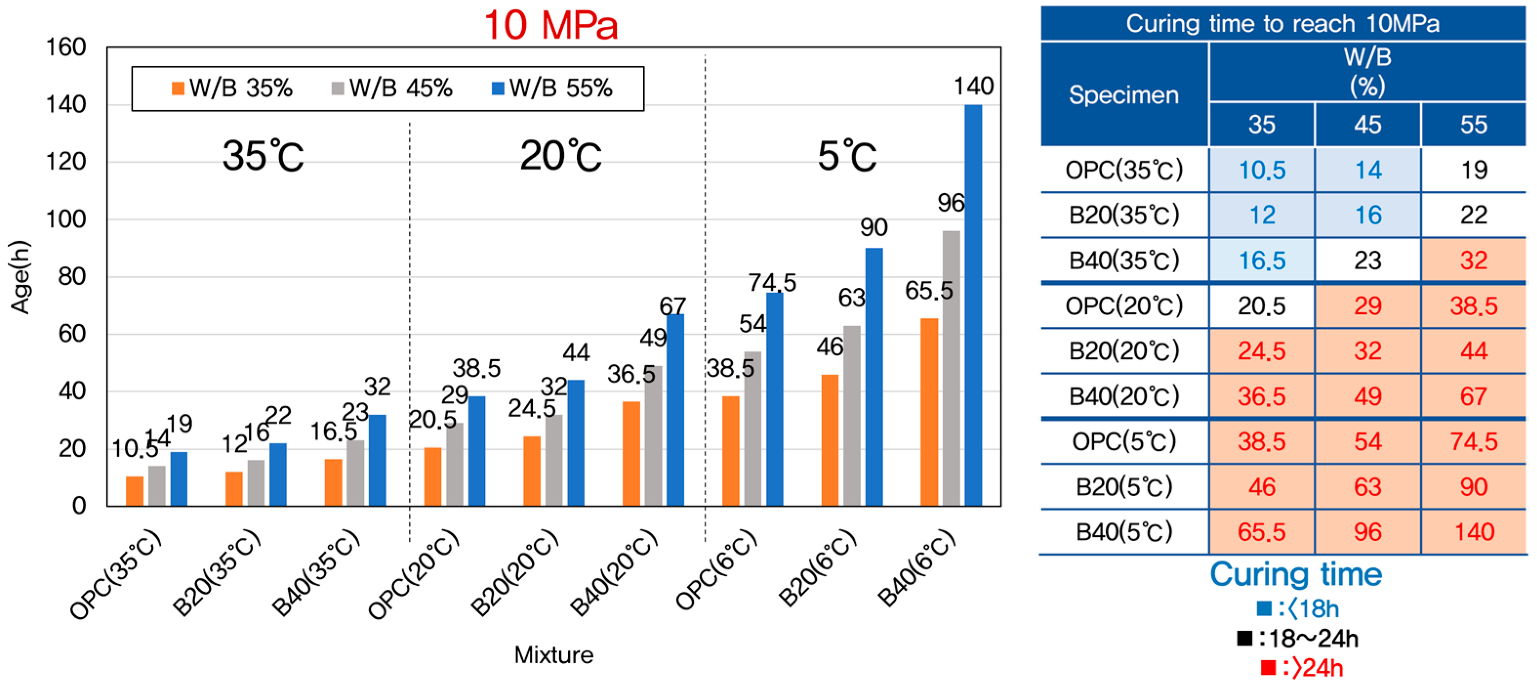 - Higher curing temperatures accelerated strength development. For example, at 35 °C, both 5 MPa and 10 MPa strength levels were reached significantly faster compared to those at 5 °C, across all mixtures.
