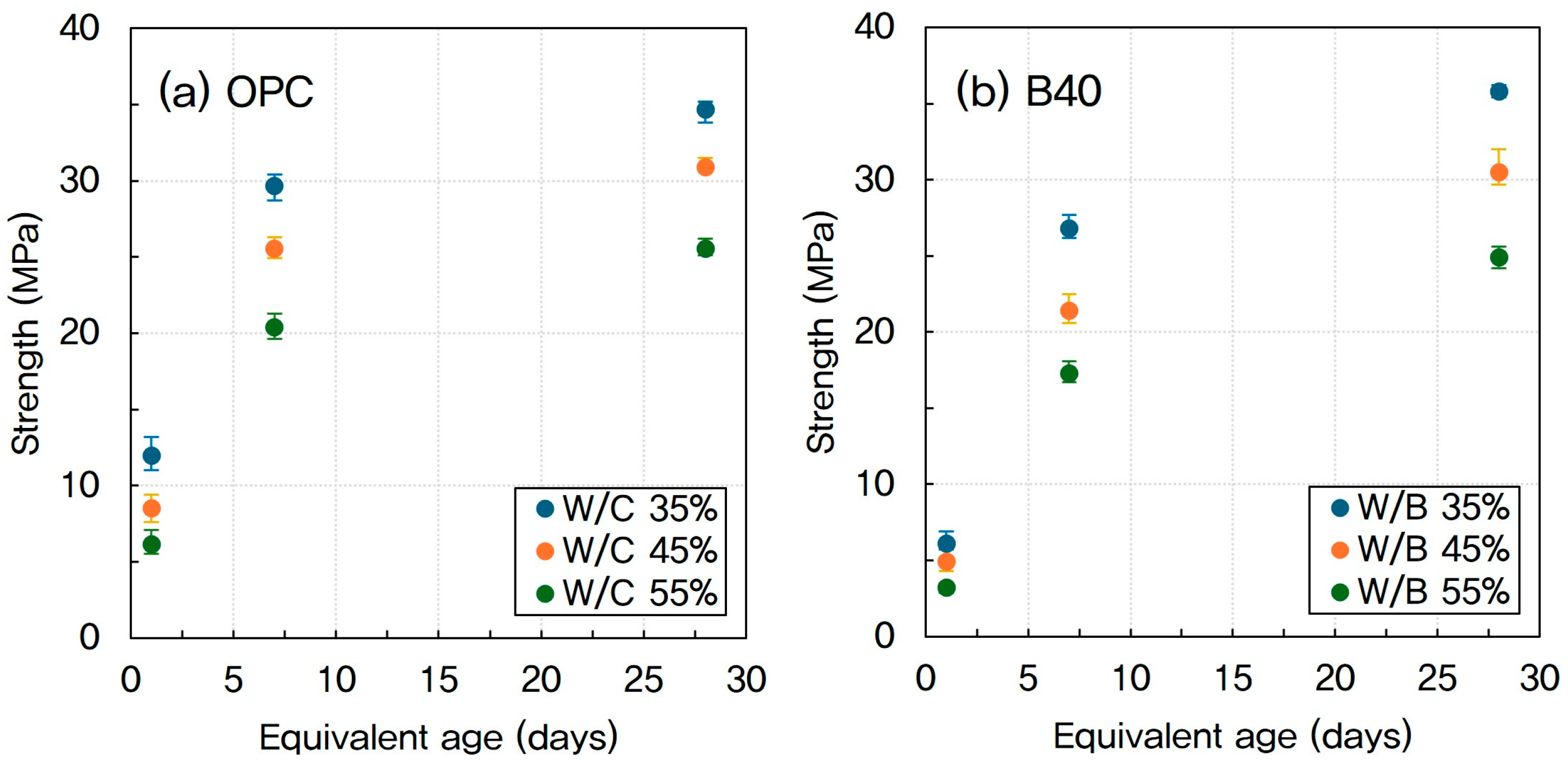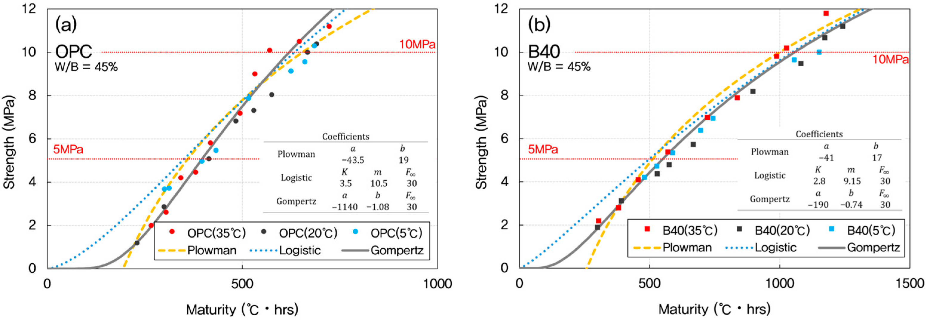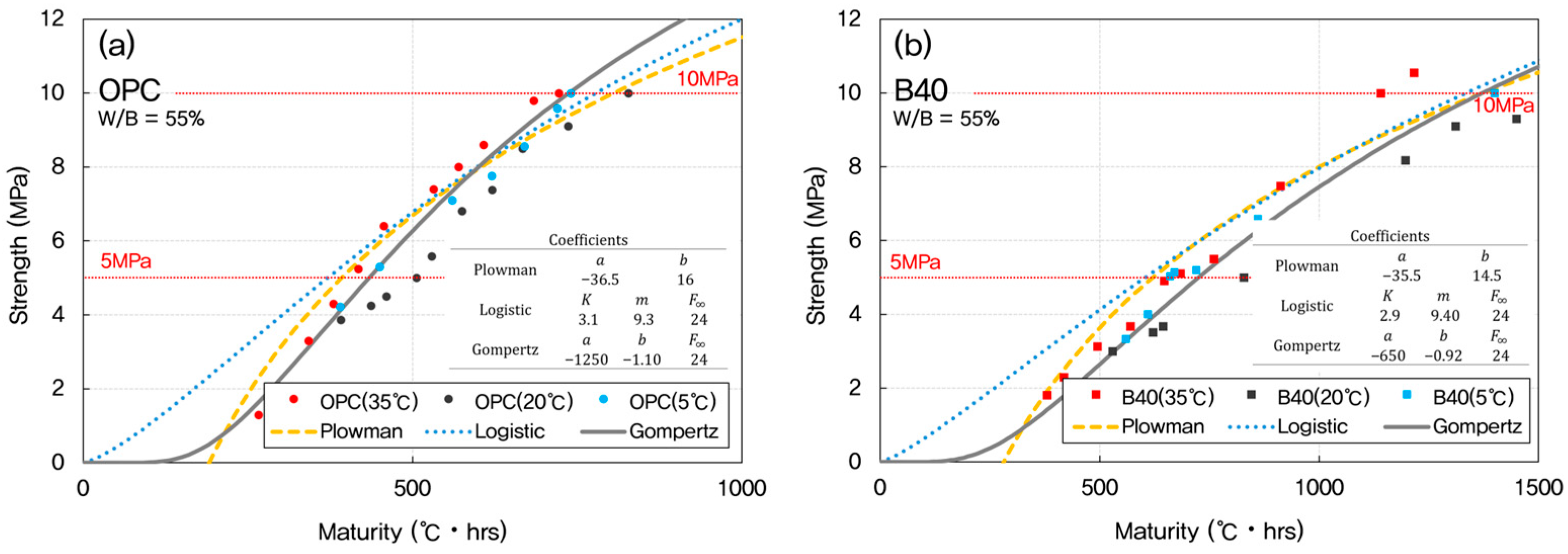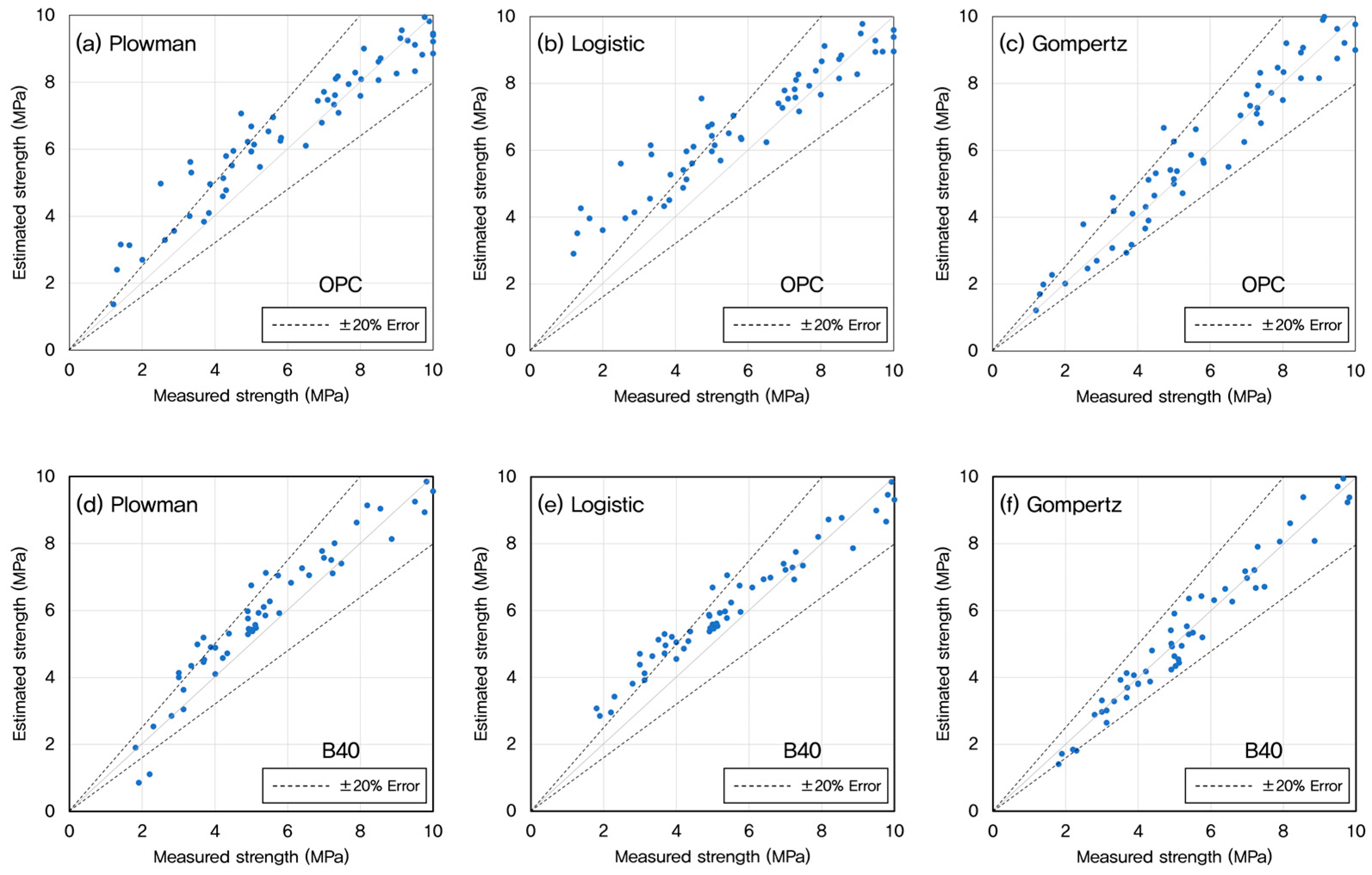 - For GGBFS-blended concrete, both the Plowman and Gompertz models showed reliable predictive performance in the early-age range of 5 to 10 MPa, although the Gompertz model generally offered higher accuracy.