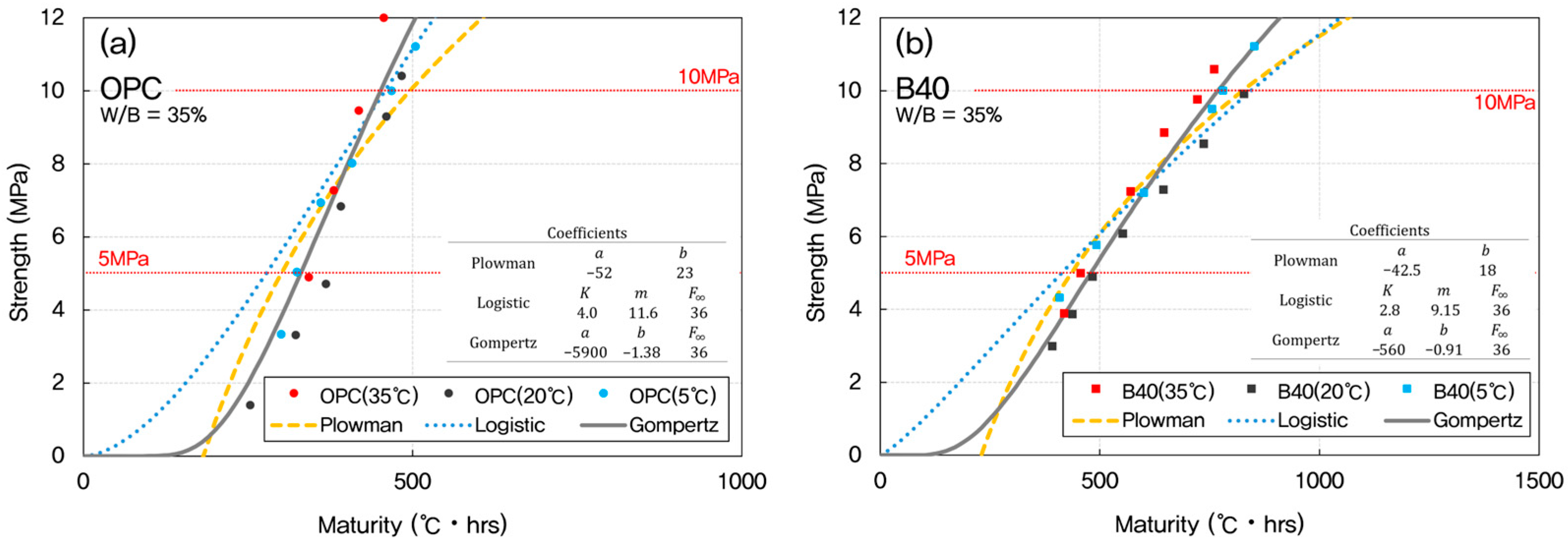 - Among the models tested, the Gompertz model provided the most accurate prediction of early-age strength. It captured the sigmoidal trend of strength gain more effectively than the Plowman and Logistic models, particularly in low W/B and slag-containing mixtures.
