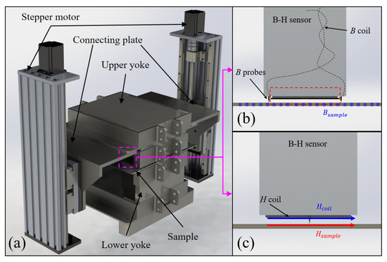 Figure 1a presents the structural arrangement of the SST apparatus. The excitation module is composed of two U-shaped magnetic yokes enclosing the driving coil. These yokes are fabricated from non-oriented silicon steel laminations in order to suppress eddy-current dissipation. In operation, the upper and lower yokes are aligned symmetrically with respect to the specimen, generating counter-acting magnetizing fields that facilitate a homogeneous distribution of magnetic flux.