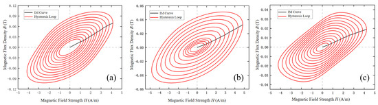 Figure 6 presents the measured hysteresis loops and initial magnetization curves (IC curve) of the specimen under increasing excitation fields at 11 Hz, 57 Hz, and 69 Hz. As shown, the area of the hysteresis loop expands with the increase in the magnetic field generated by the SST, indicating that the energy loss of the permalloy specimen grows during the magnetization process. Furthermore, when the magnetic field intensity is below 5 A/m at these three frequencies, the initial magnetization curve is nearly linear, suggesting that the material is in the initial magnetization region.